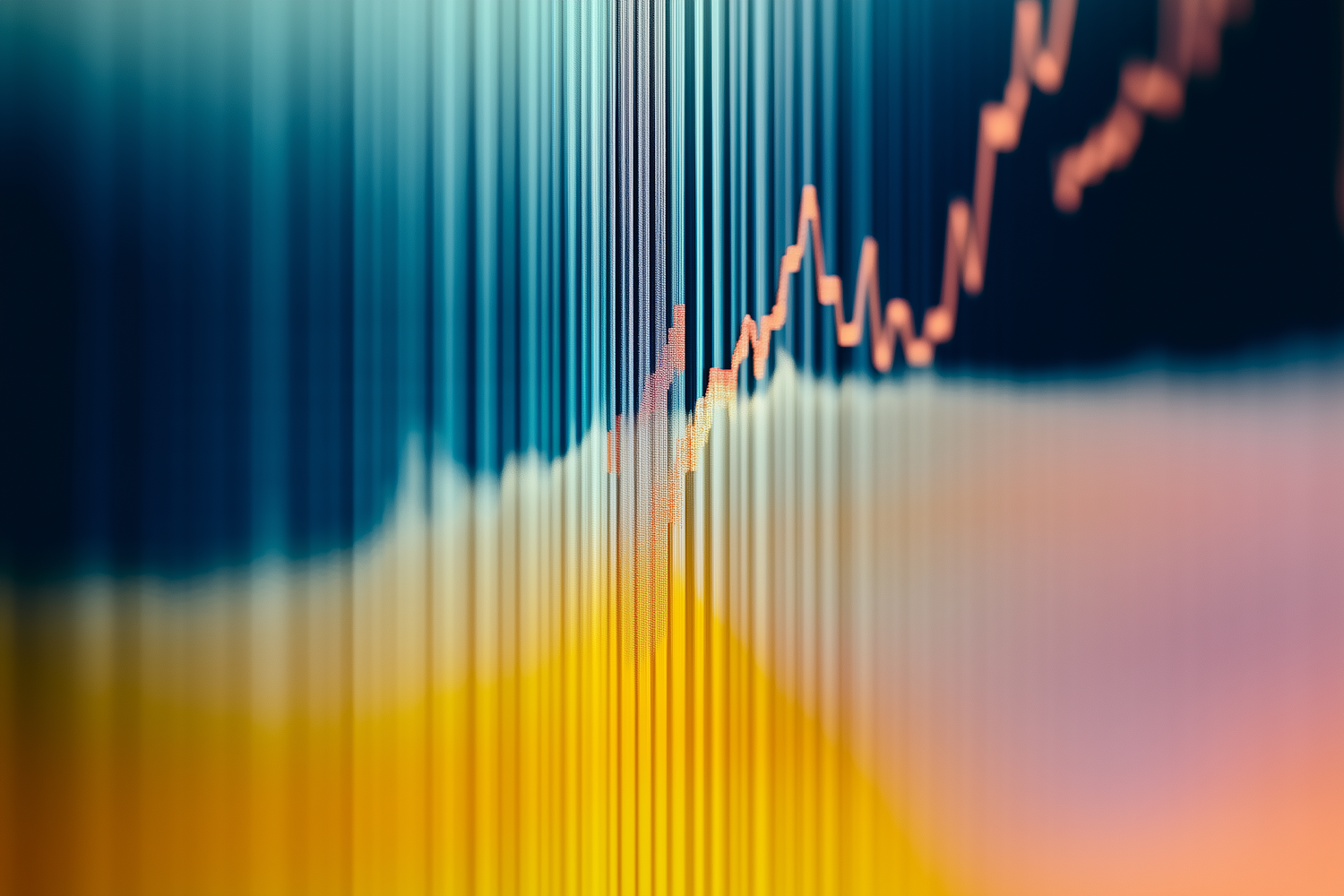 Abstract financial graph with vibrant blue, yellow, and orange tones, featuring a jagged orange trend line and blurred vertical lines.