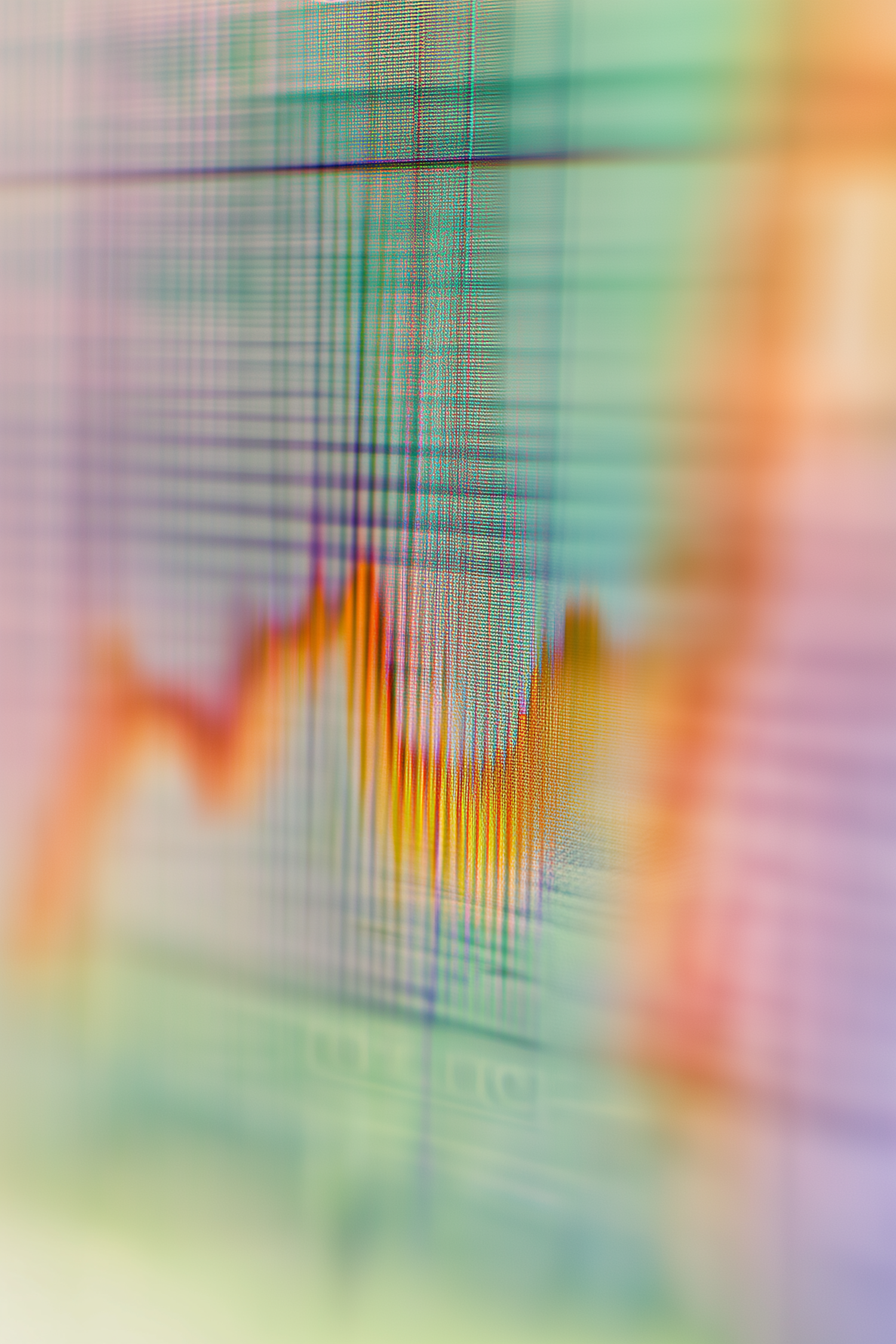 Abstract blurred graph with vibrant orange, green, and purple hues, showcasing wavy data trends and faint gridlines for a modern aesthetic.