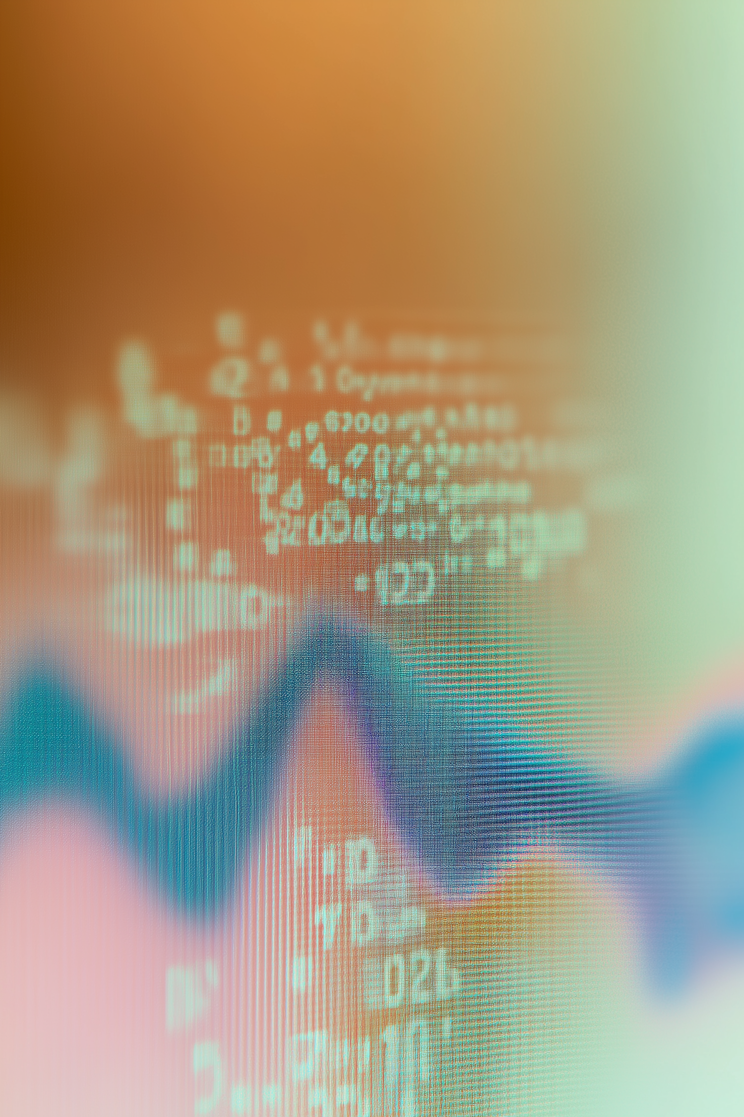 Abstract image with glowing data, a wavy blue line, and gradient orange-green tones, evoking a futuristic tech or data visualization theme.