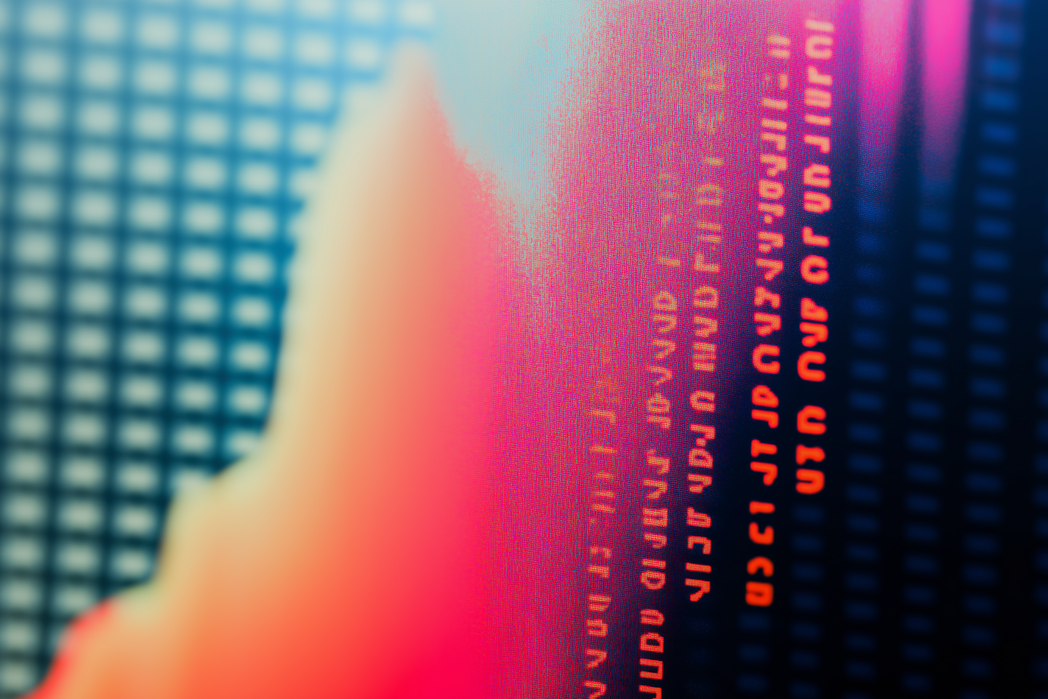 Abstract digital art with vibrant gradients, grid patterns, and vertical red text, evoking a futuristic and tech-inspired aesthetic.