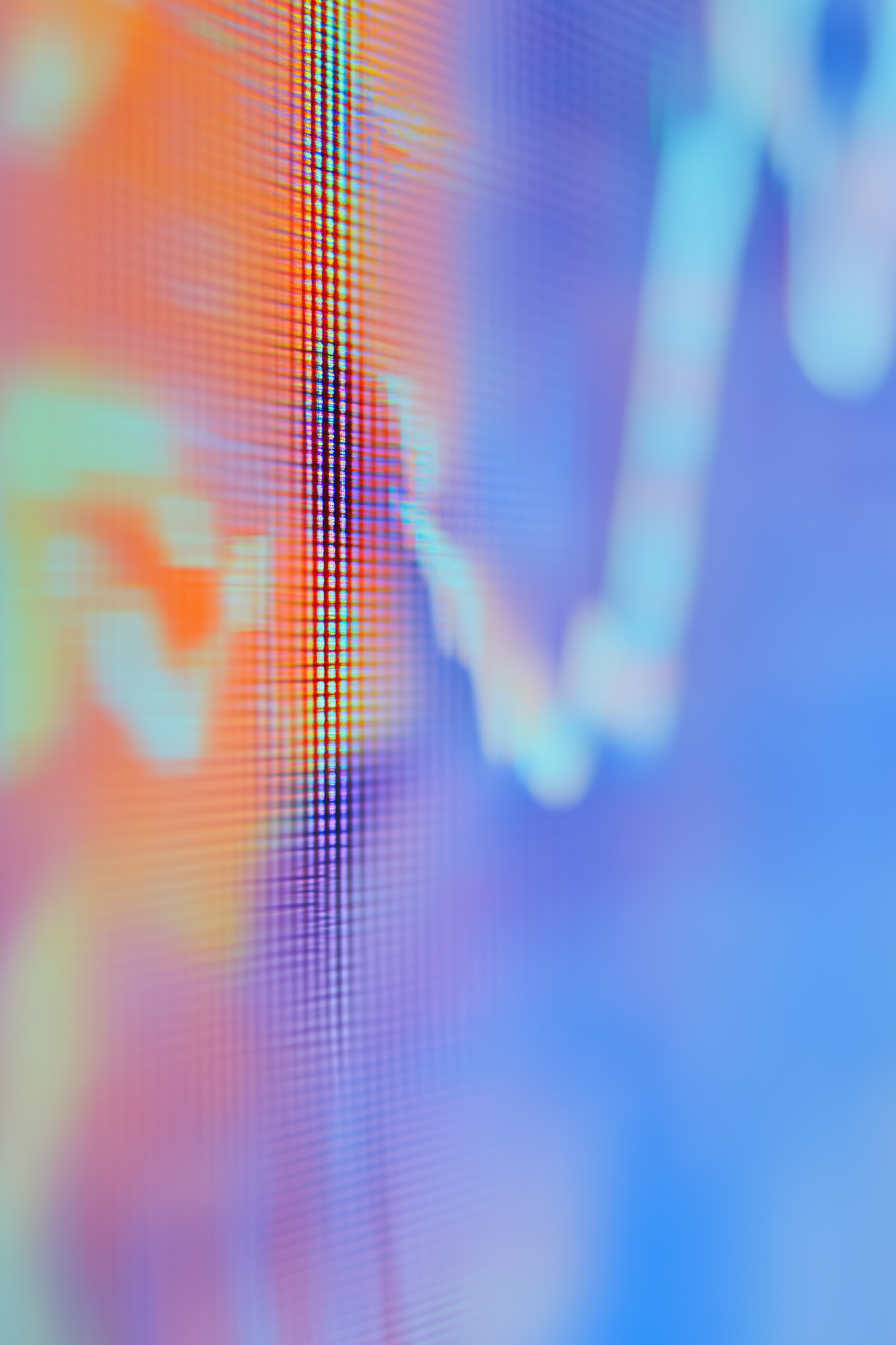 Abstract close-up of a digital screen with vibrant pixelated colors and a faint line graph, blending orange, blue, and purple hues.