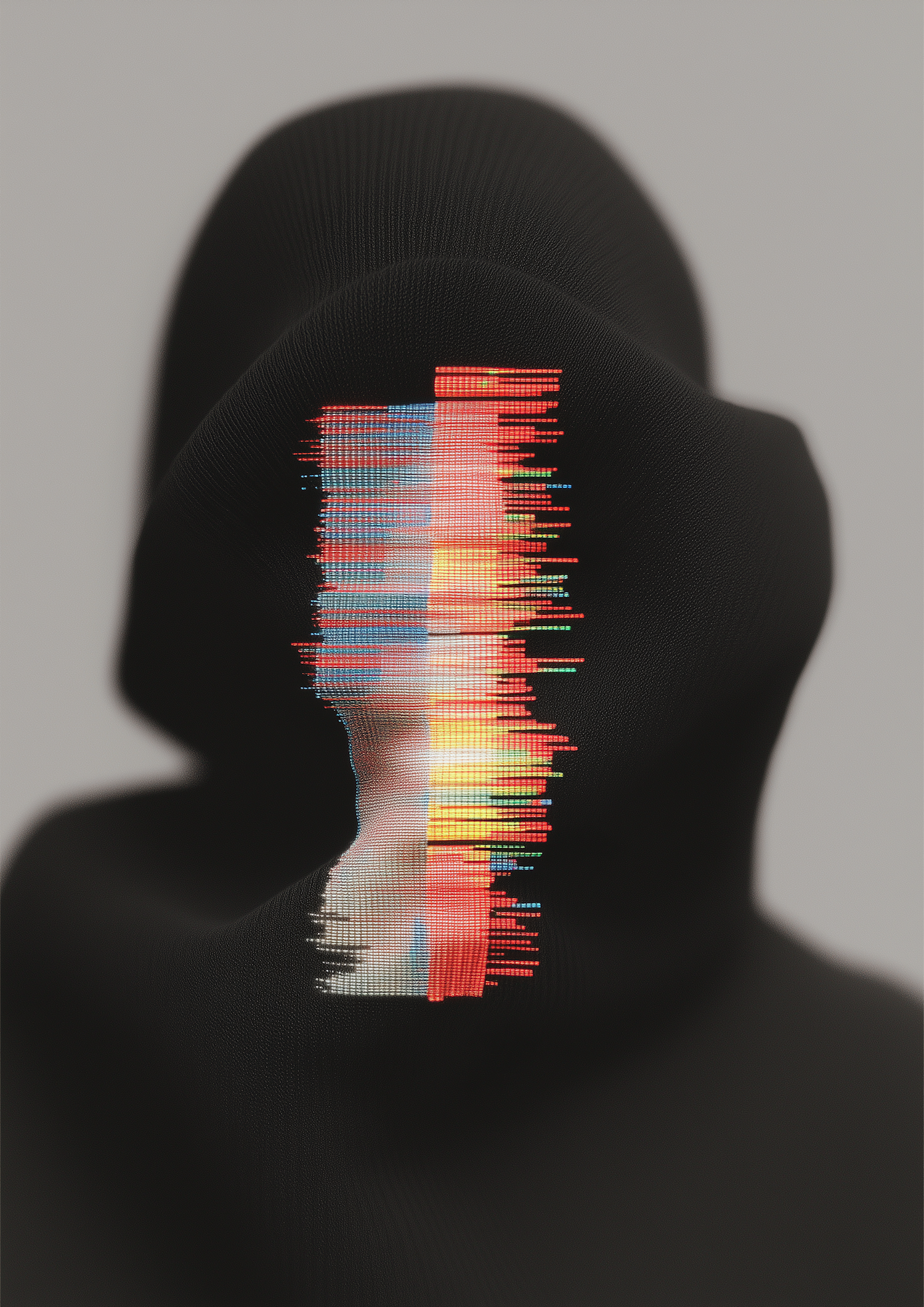 Abstract figure in black fabric with vibrant glitch-like digital overlay on face, blending mystery and technology in a minimalist setting.