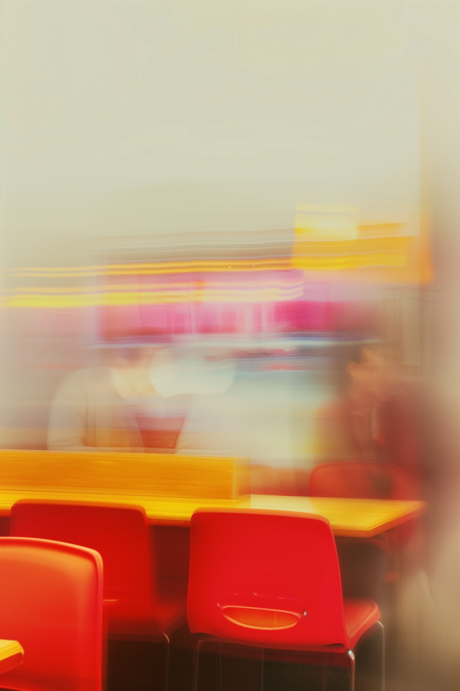 Abstract dining area with red chairs, wooden tables, and vibrant streaks of pink, yellow, and orange in a blurred, dreamy composition.