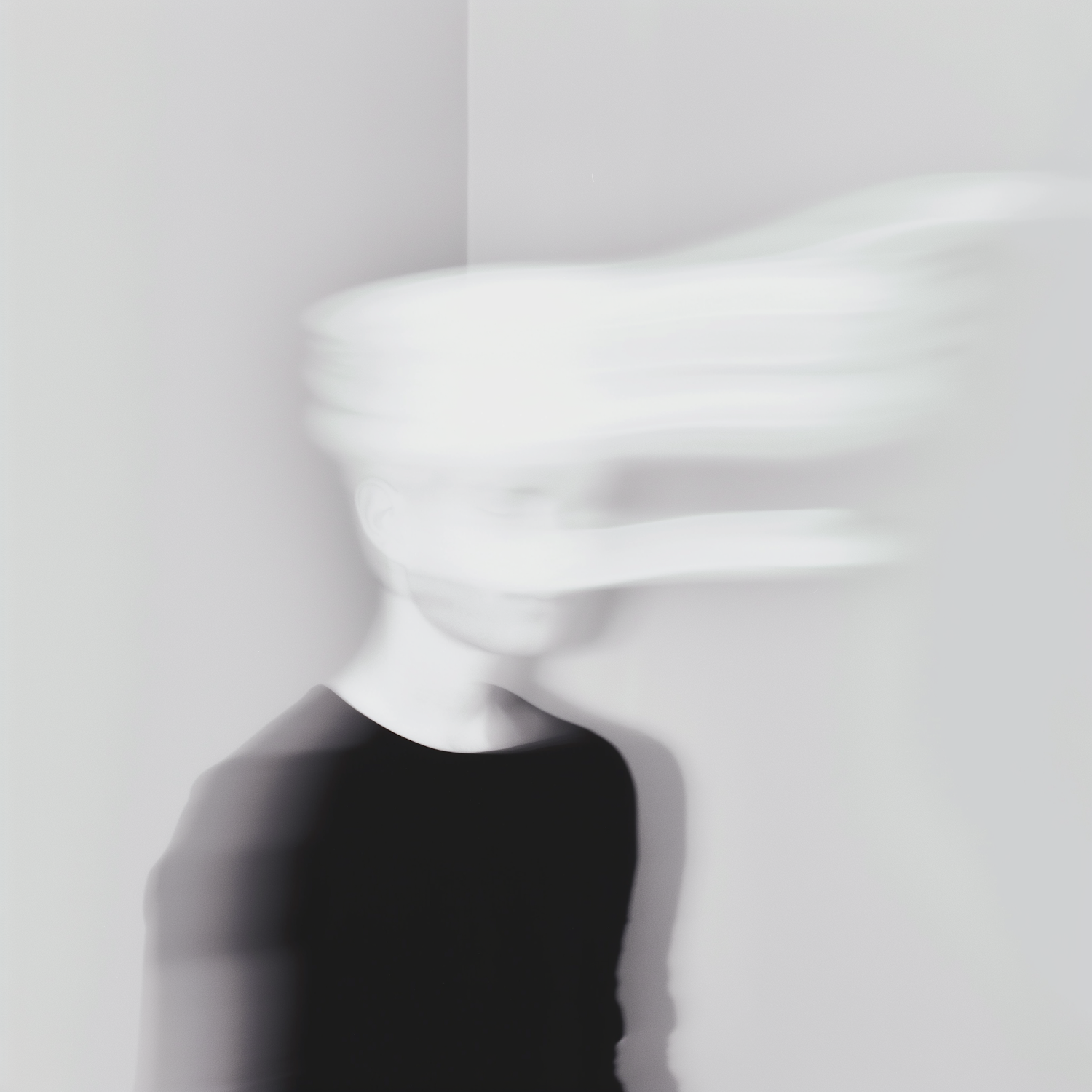 Abstract black-and-white image of a person with a blurred, distorted head, creating a surreal and minimalistic visual effect.
