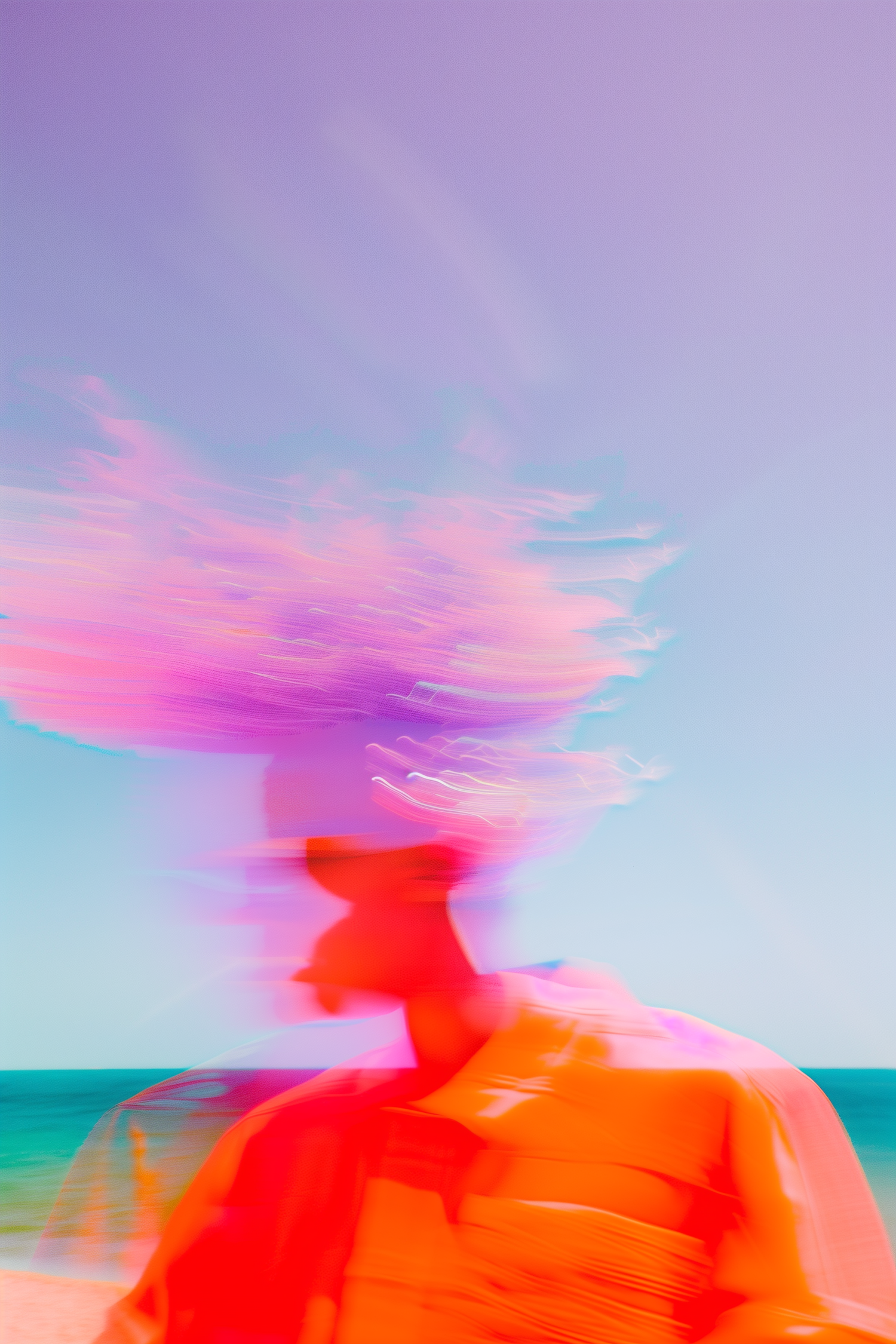 Abstract image of a blurred figure in vibrant orange with streaks of pink and purple hair, set against a pastel sky and turquoise ocean.