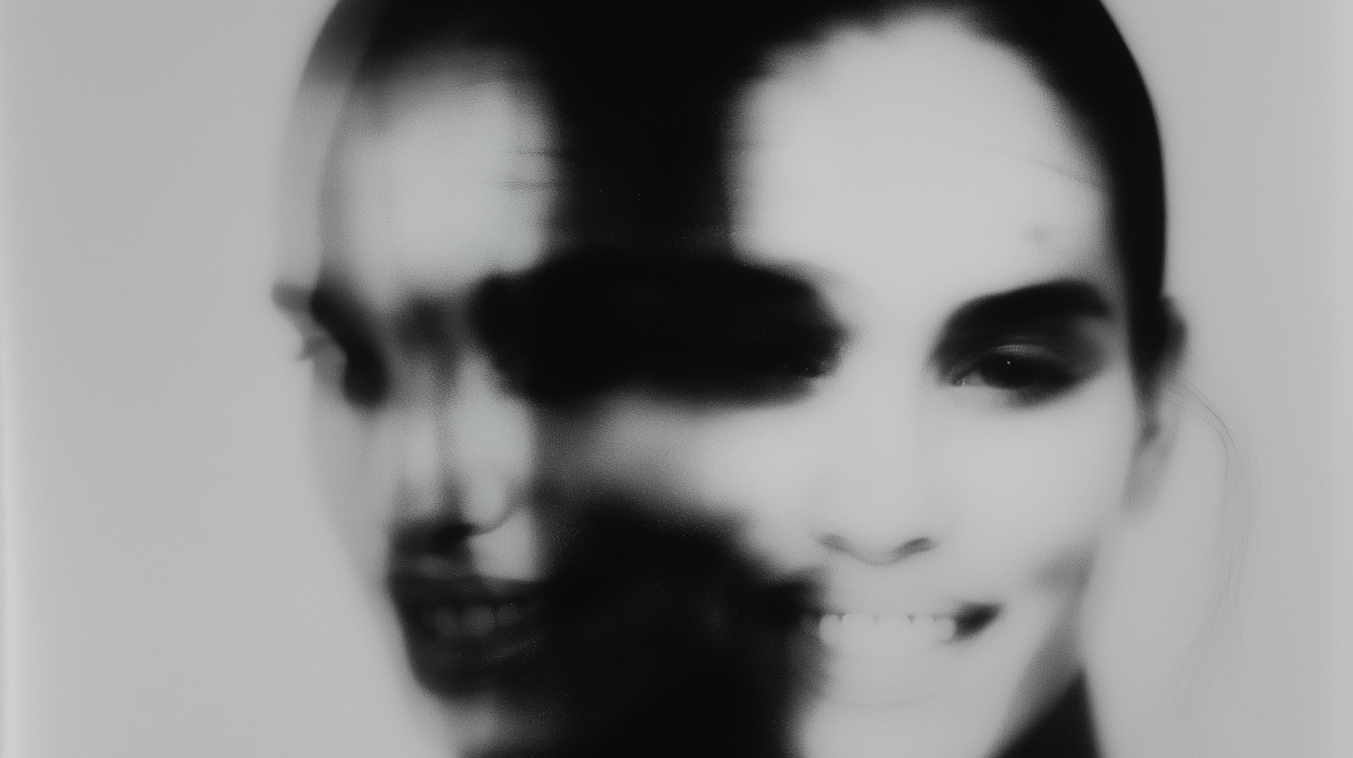 Abstract black-and-white double-exposure portrait of a female face, blending clarity and distortion for a surreal, ghostly effect.