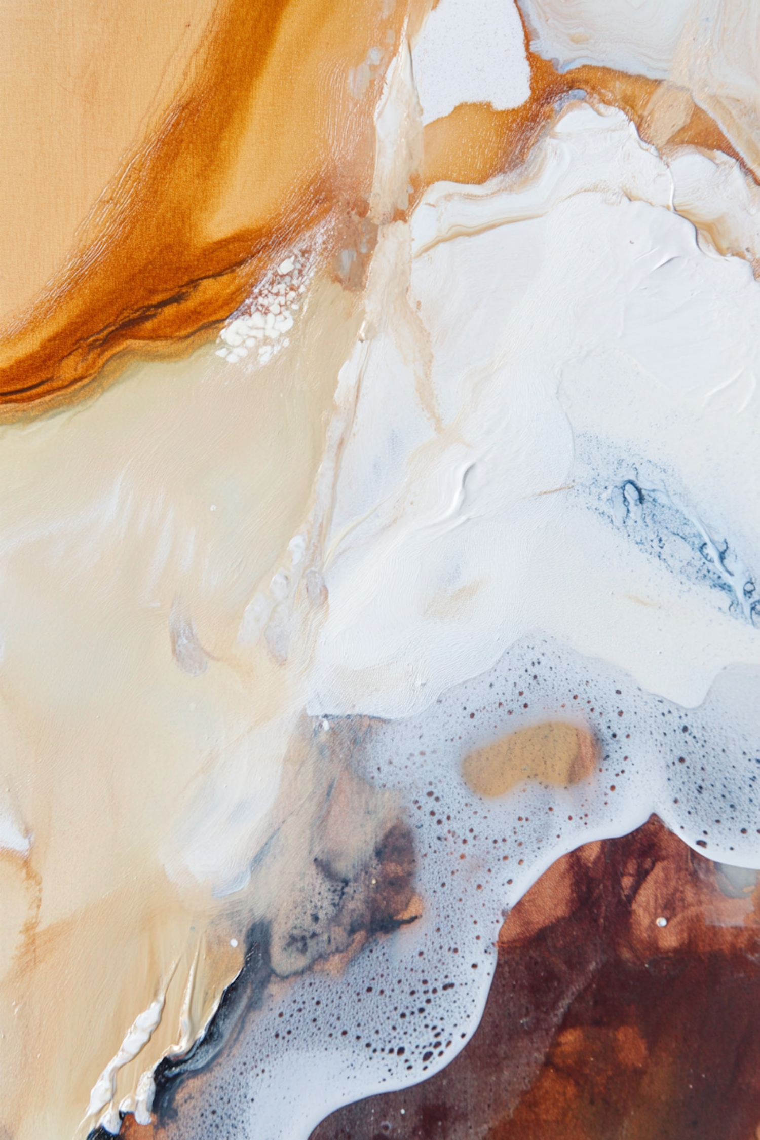 Abstract painting with earthy tones, featuring swirling patterns of brown, orange, and white, creating a fluid and dynamic composition.