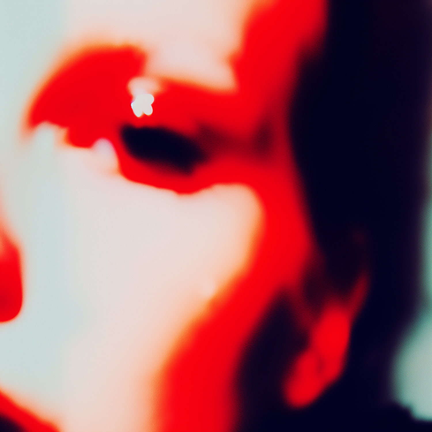 Abstract close-up of a face with bold red, white, and black tones, creating a surreal and intense visual effect.