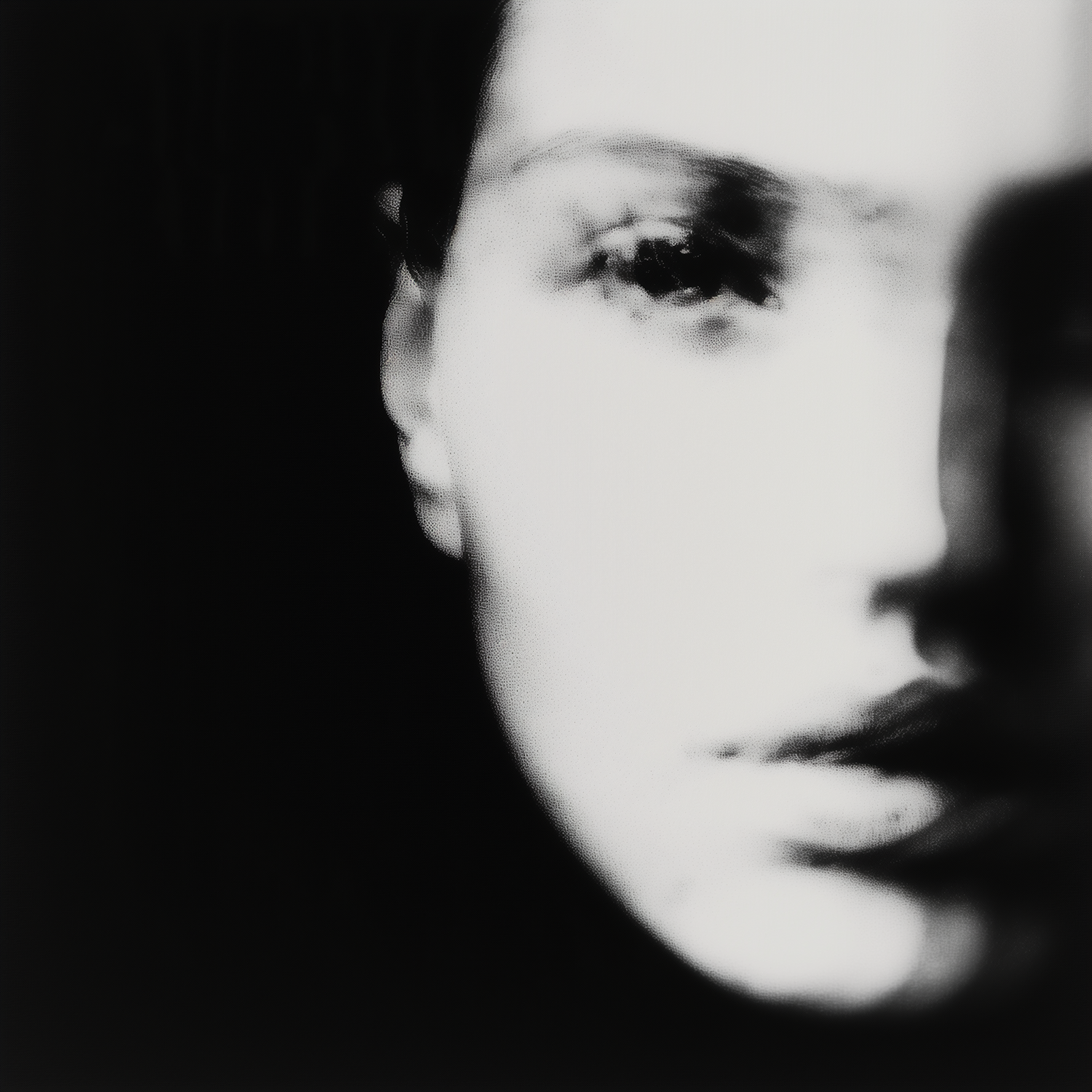 Abstract high-contrast portrait with blurred features, emphasizing light and shadow interplay for a mysterious, dreamlike effect.