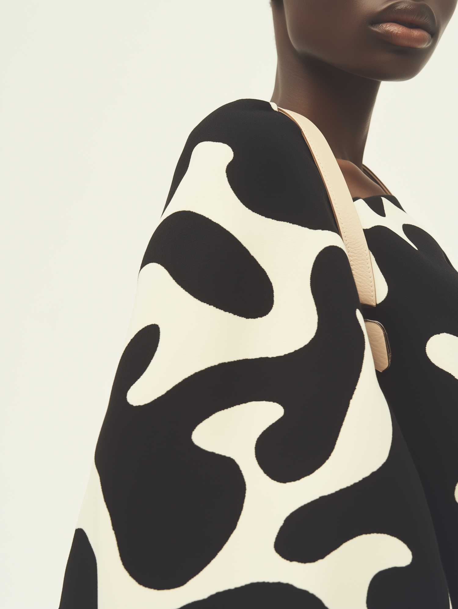 Close-up of a person in a bold black and white abstract outfit with a beige strap, set against a neutral background.