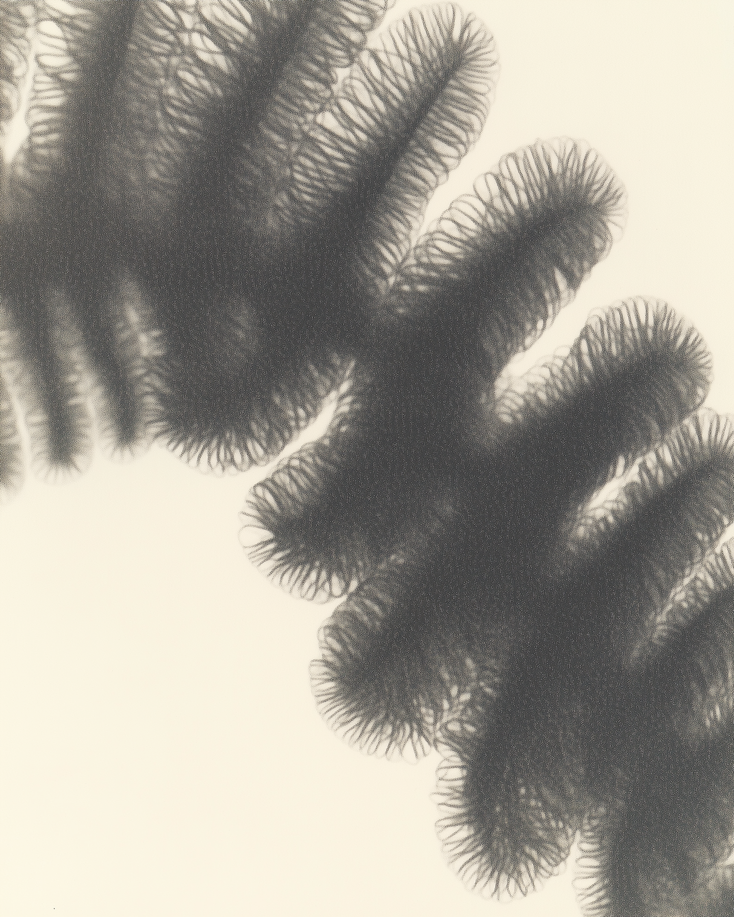 Abstract close-up of a feathery, organic structure with intricate patterns on a soft beige background, evoking natural beauty.