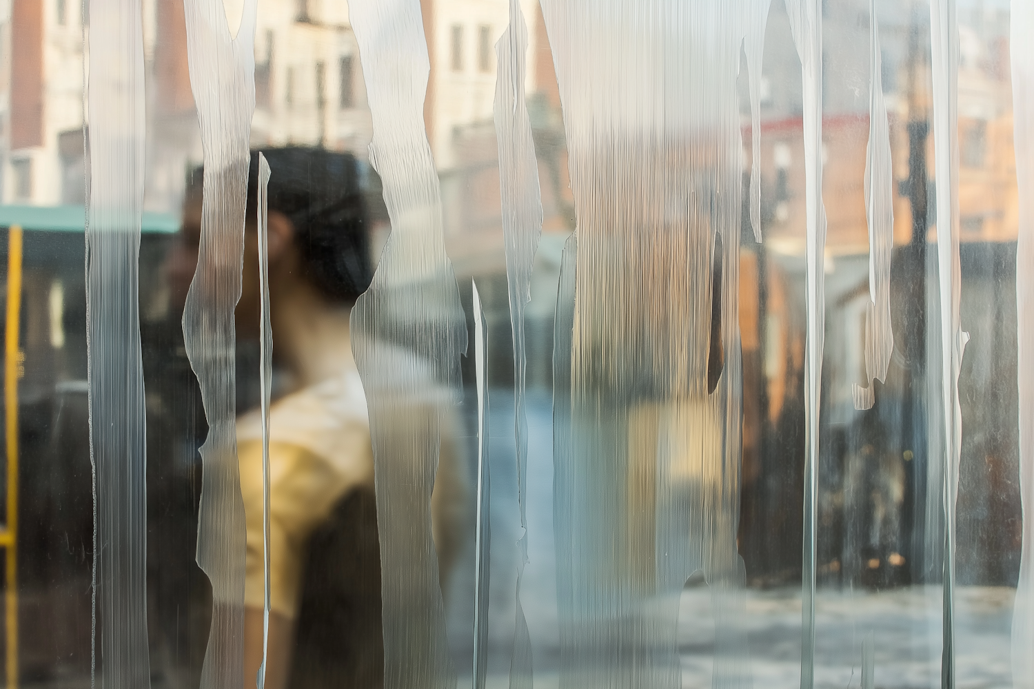Abstract view through a streaked glass pane with a blurred figure and urban background, creating a textured and muted visual effect.