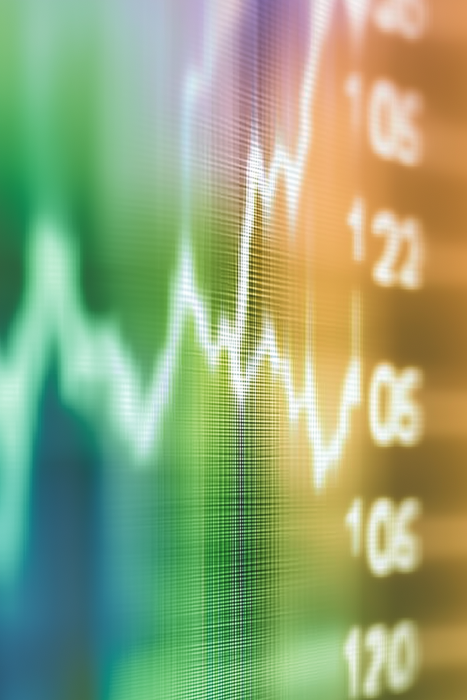 Abstract financial chart with a white line graph on a gradient background of green, blue, and orange hues, symbolizing market trends.