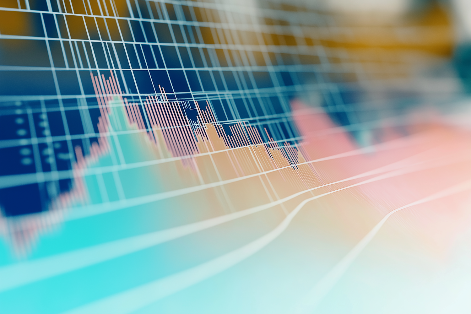 Abstract financial data visualization with colorful bar graphs and line charts on a grid, symbolizing market trends and analytics.