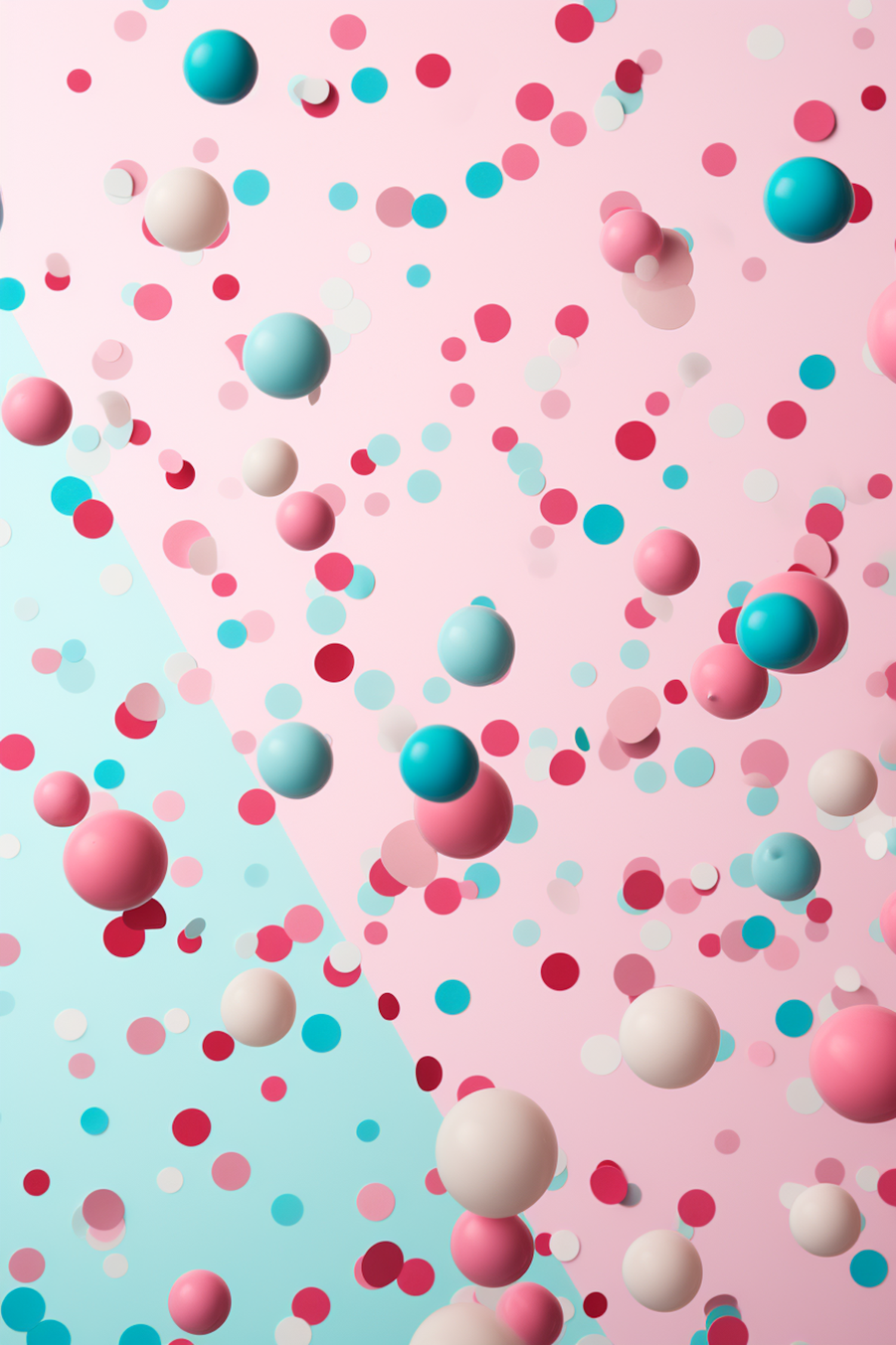 Colorful spheres and confetti on a pastel pink and blue background, creating a festive and playful atmosphere.