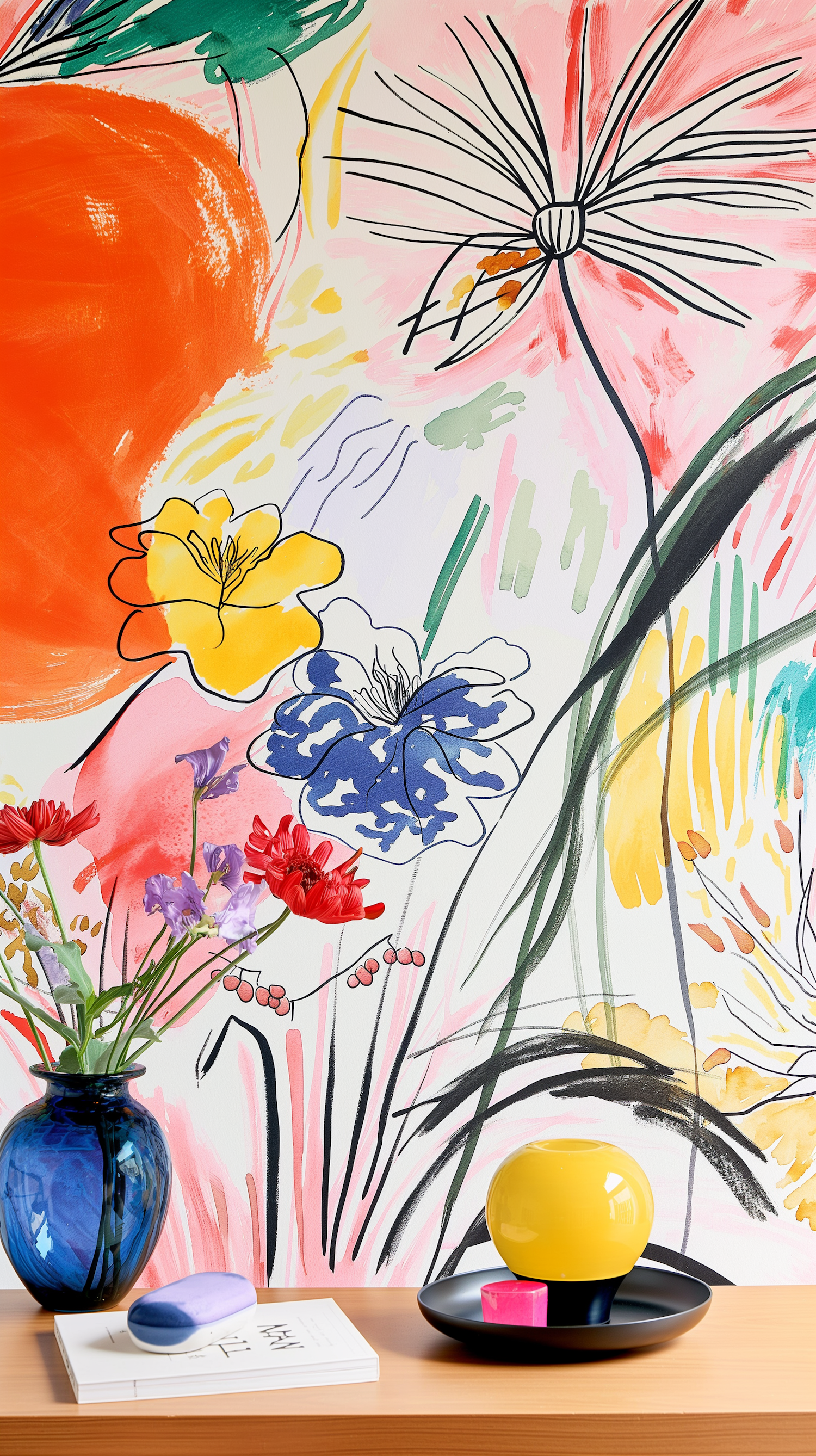 Colorful abstract floral painting with a blue vase of flowers, books, and decorative objects on a wooden surface.