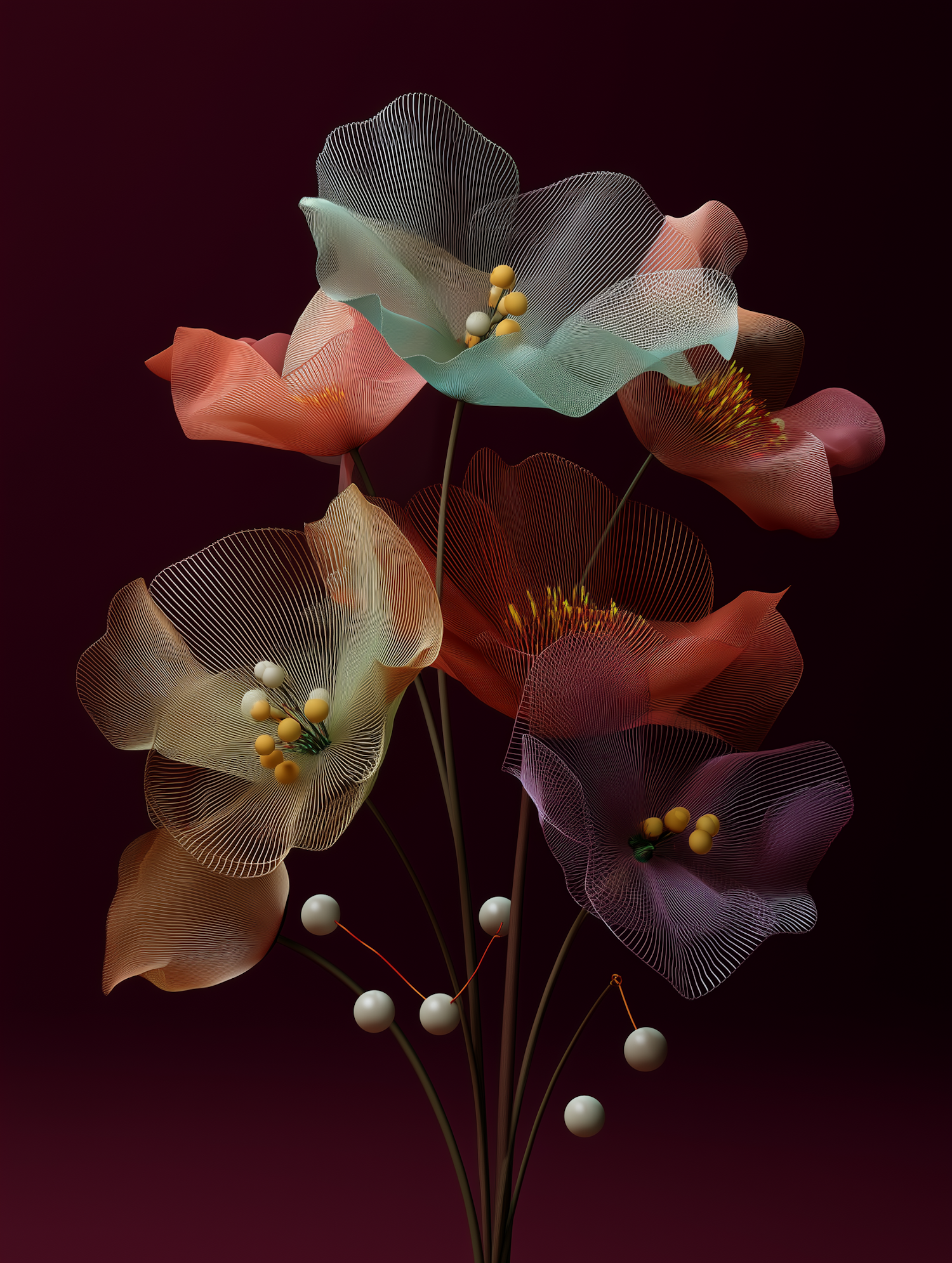 Elegant abstract flowers with pastel petals and intricate textures on a deep burgundy background, creating a modern artistic vibe.