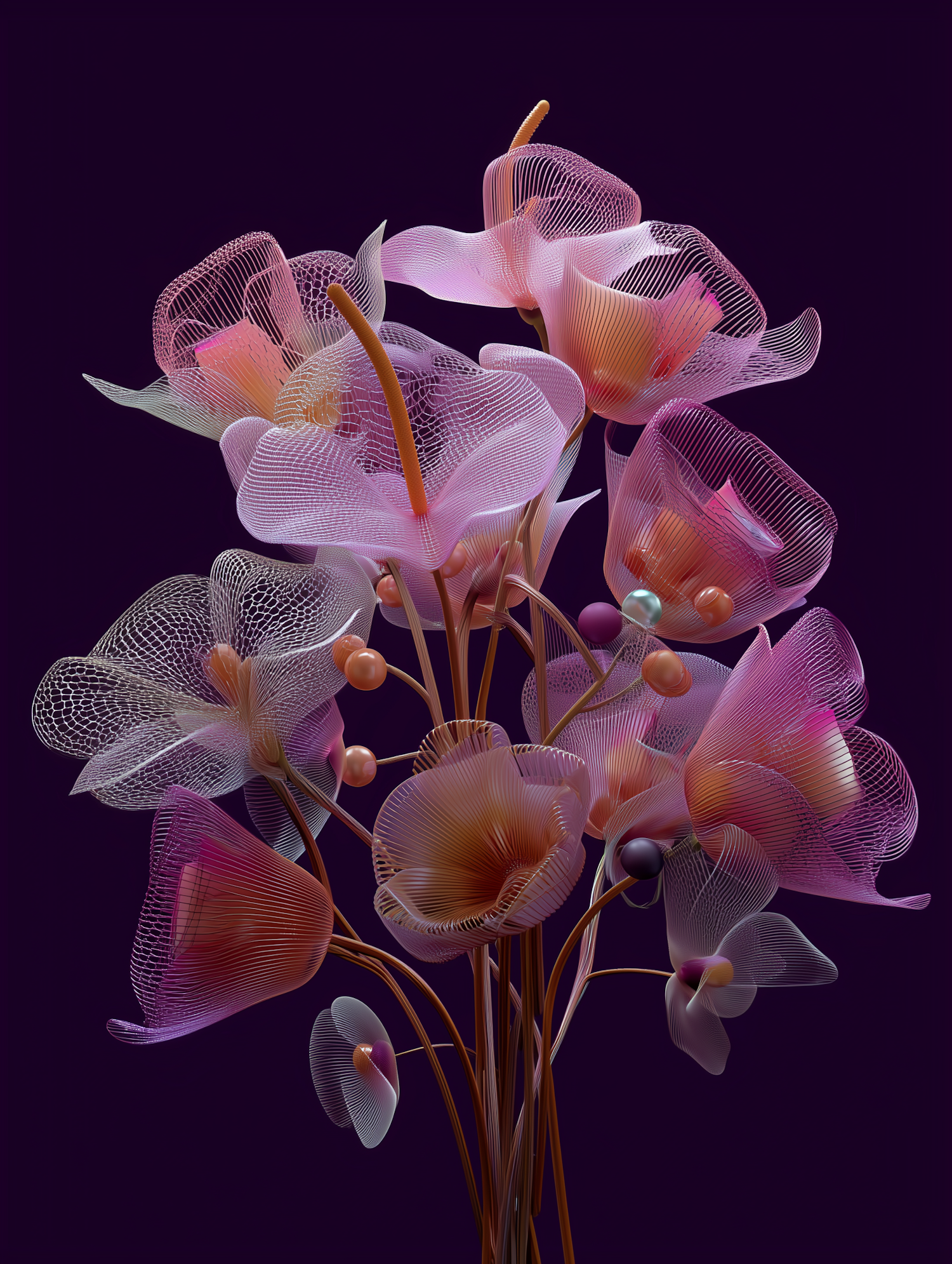 A mesmerizing 3D bouquet of translucent, mesh-like flowers in pink and orange hues, set against a deep purple background.