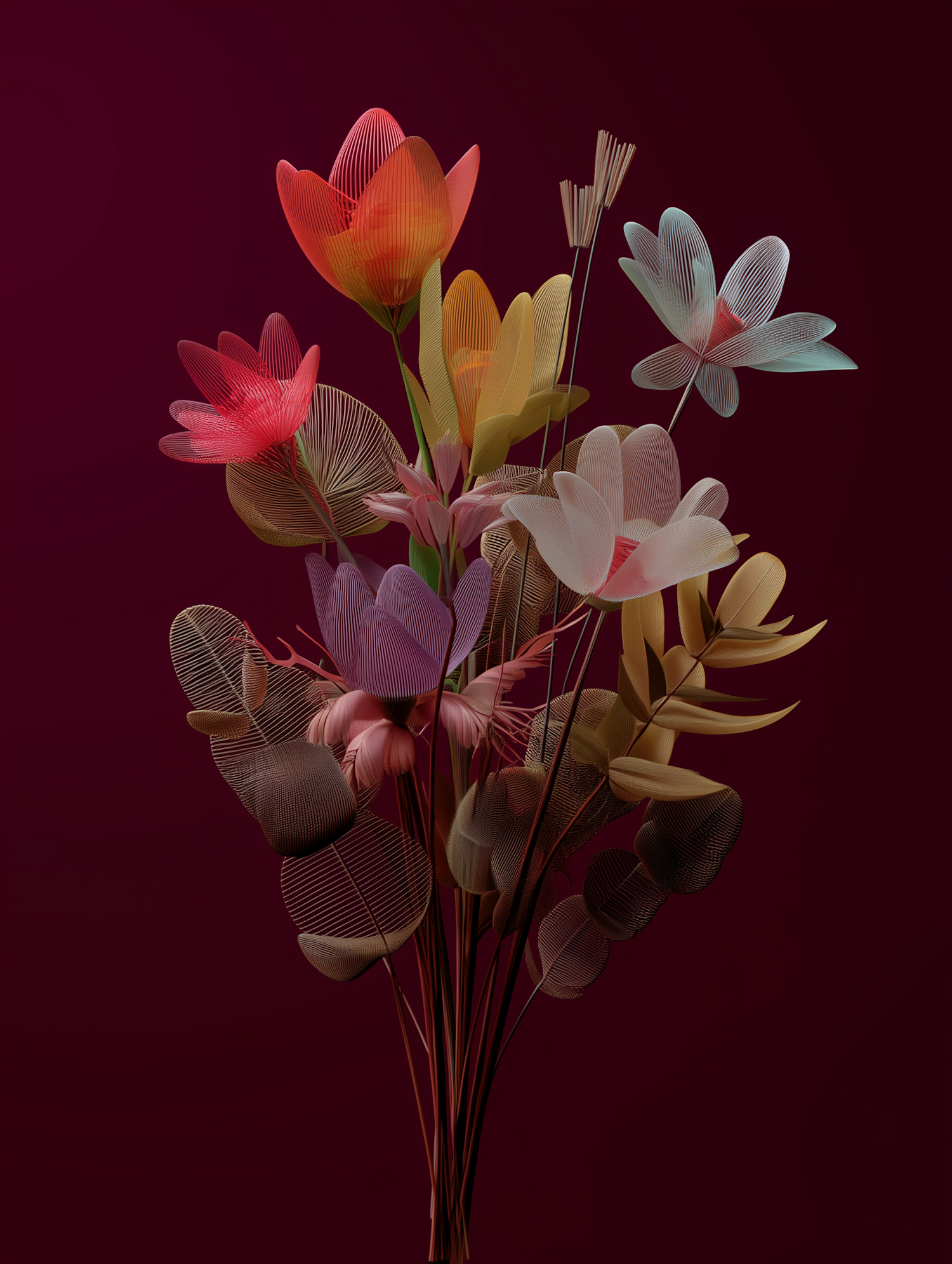 A vibrant digital bouquet of abstract flowers with translucent petals on a deep maroon background, blending modern art and nature.
