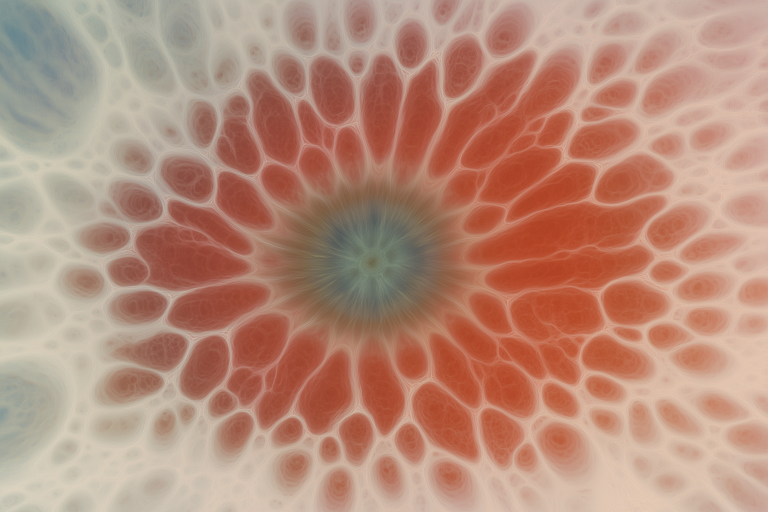 Abstract cellular pattern with vibrant red and orange hues radiating from a blue-green center, creating a dynamic and organic design.