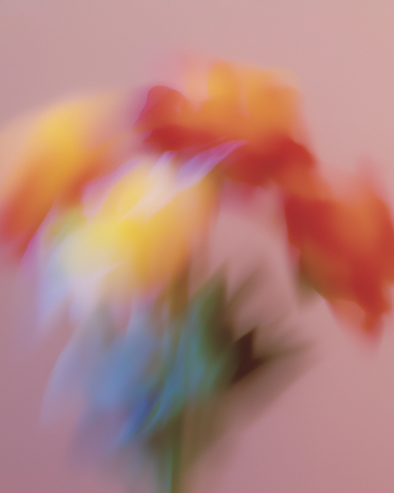 A dreamy, abstract image of colorful flowers with soft, blurred hues of red, yellow, and green against a muted pink background.