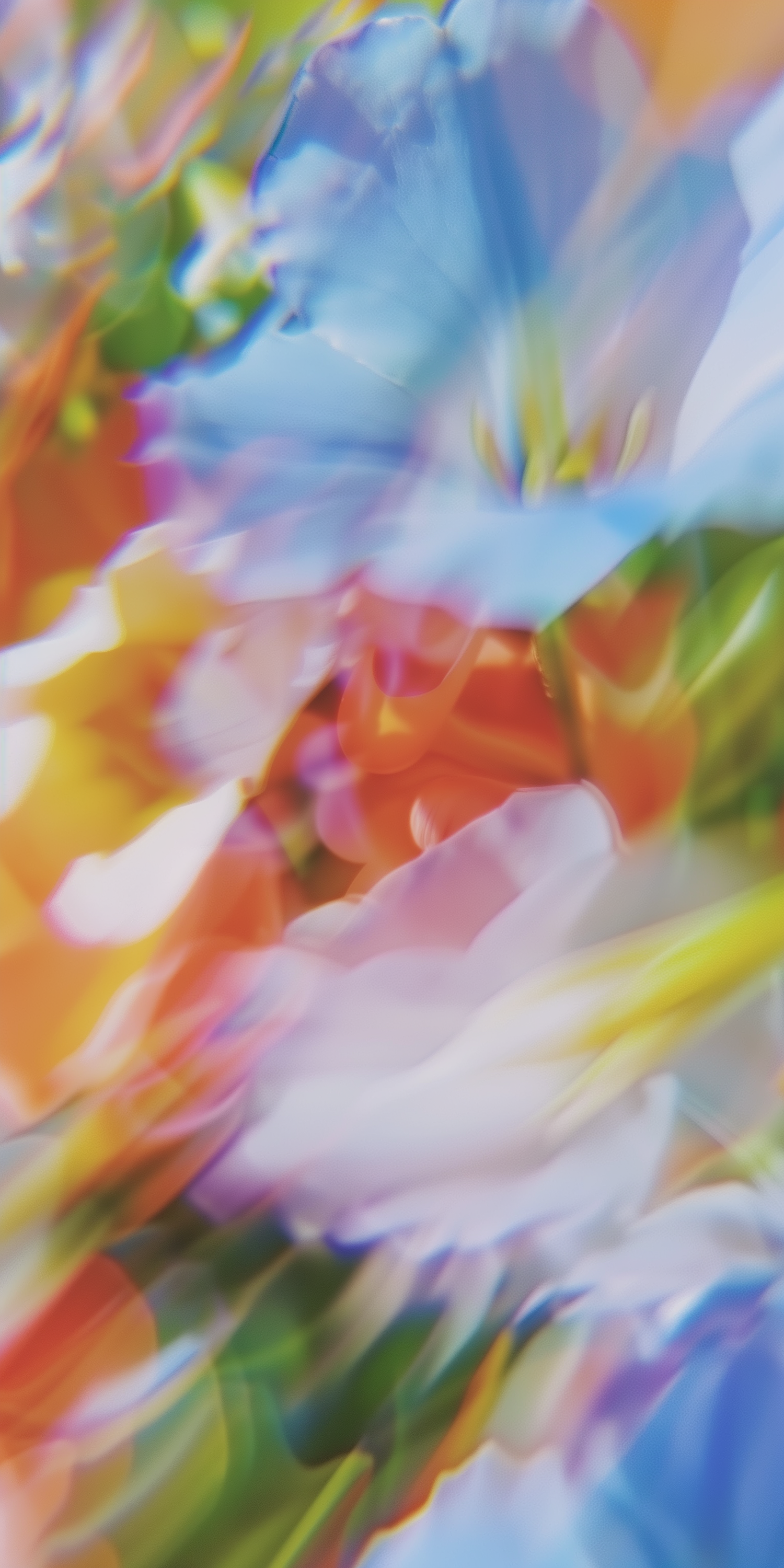 Abstract floral composition with vibrant blue, orange, yellow, and pink hues blending in soft focus for a dreamy, ethereal effect.