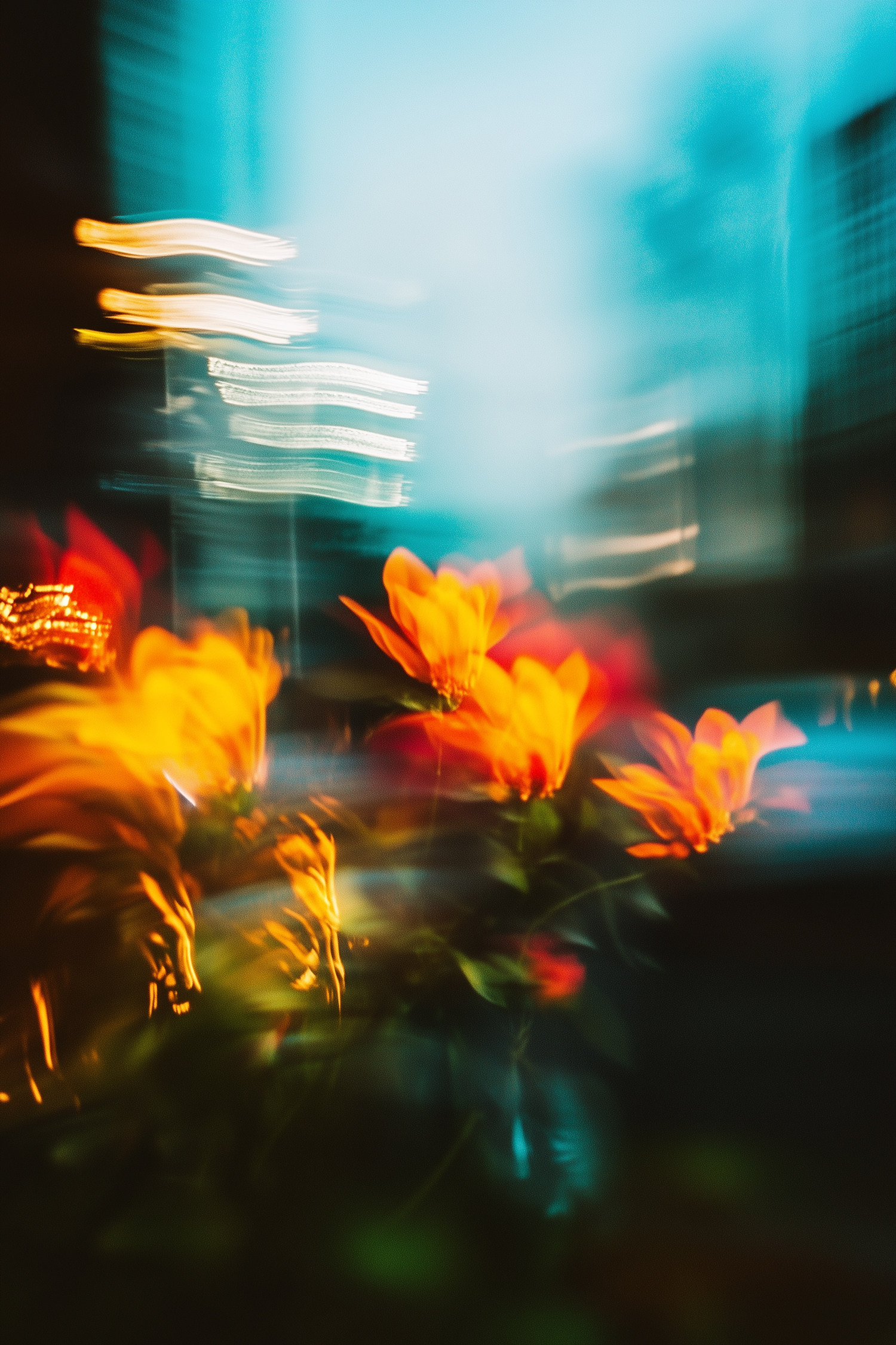 Abstract image of blurred orange flowers with dynamic motion against a soft blue background, creating a vibrant and dreamy effect.