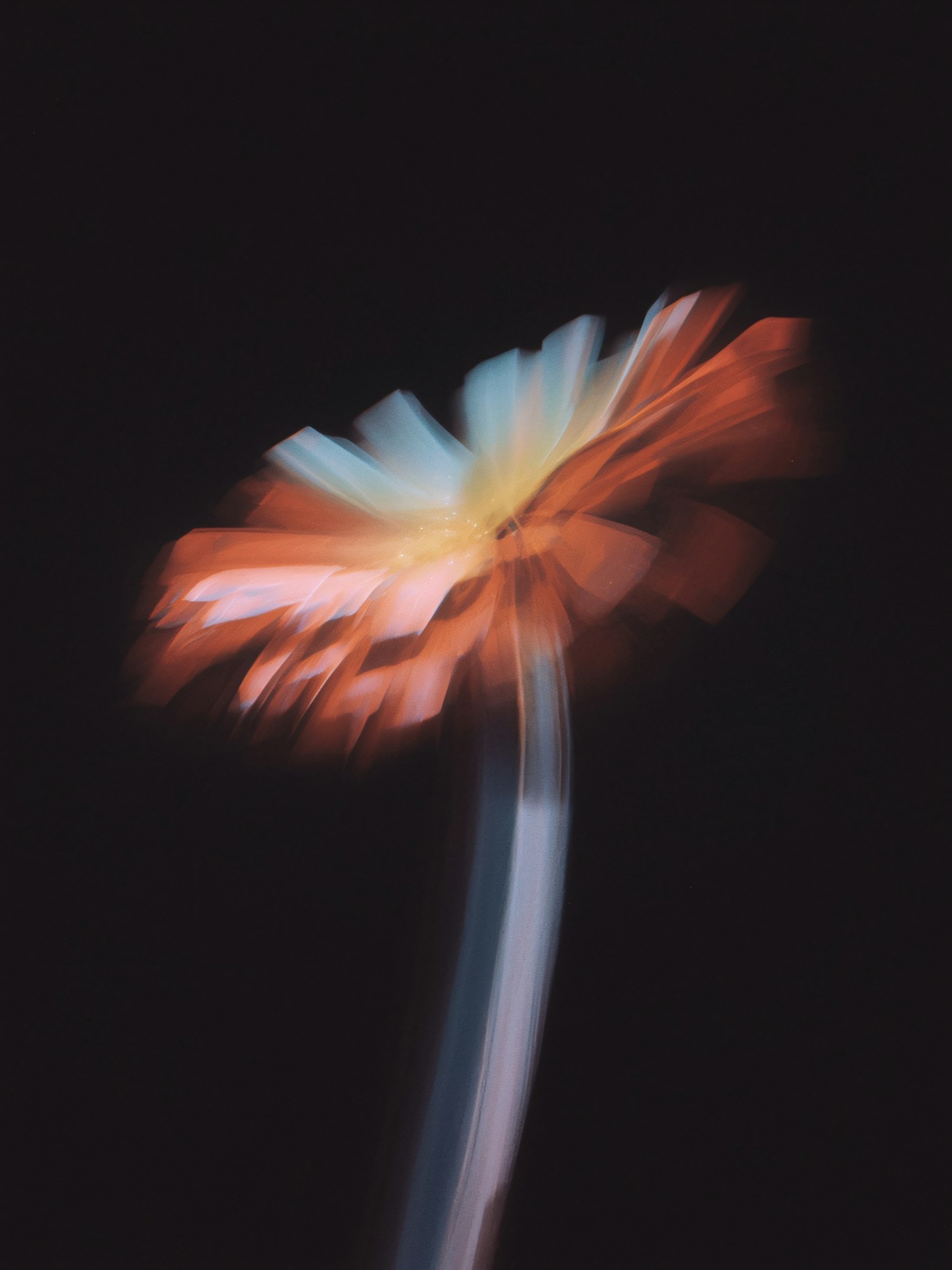 Abstract image of a flower with blurred orange, blue, and yellow petals on a dark background, creating a dynamic and artistic effect.