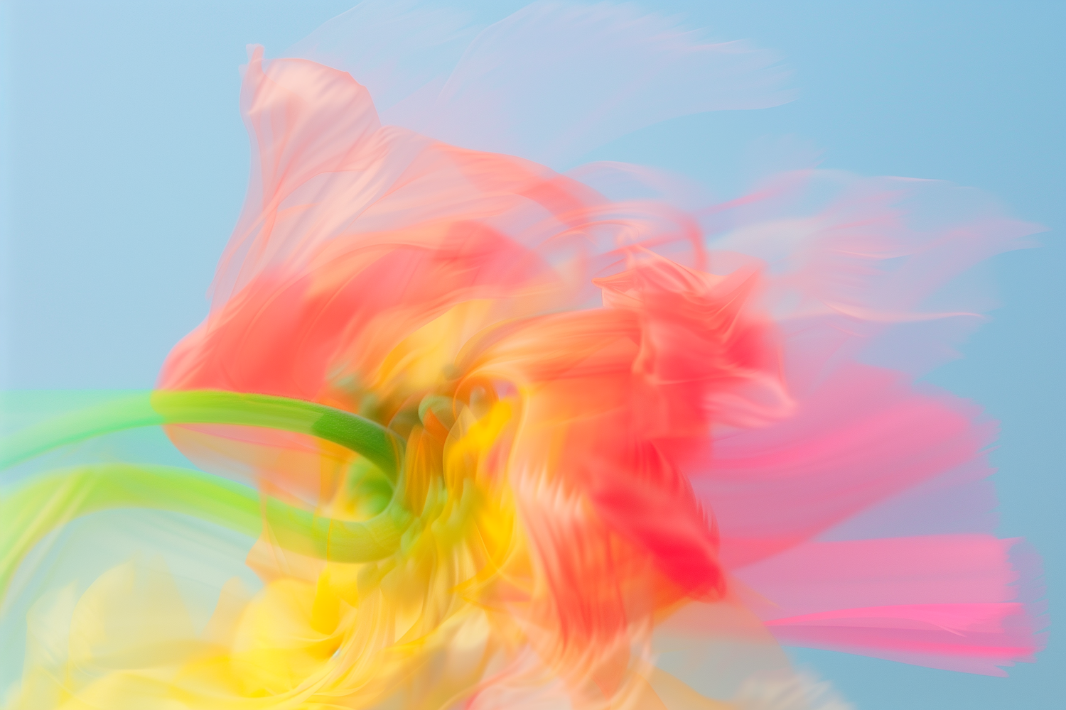 Abstract floral art with vibrant pink, orange, and yellow hues against a soft blue background. Dreamy, blurred motion creates a fluid effect.