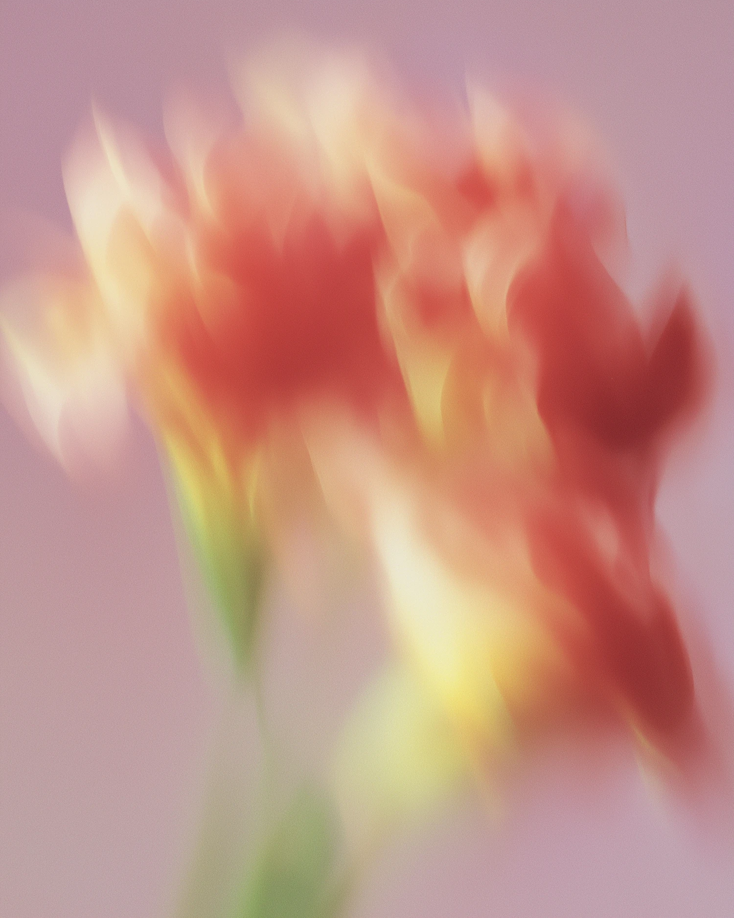 A soft-focus abstract image of a flower with warm red, orange, and yellow tones against a muted pink background.