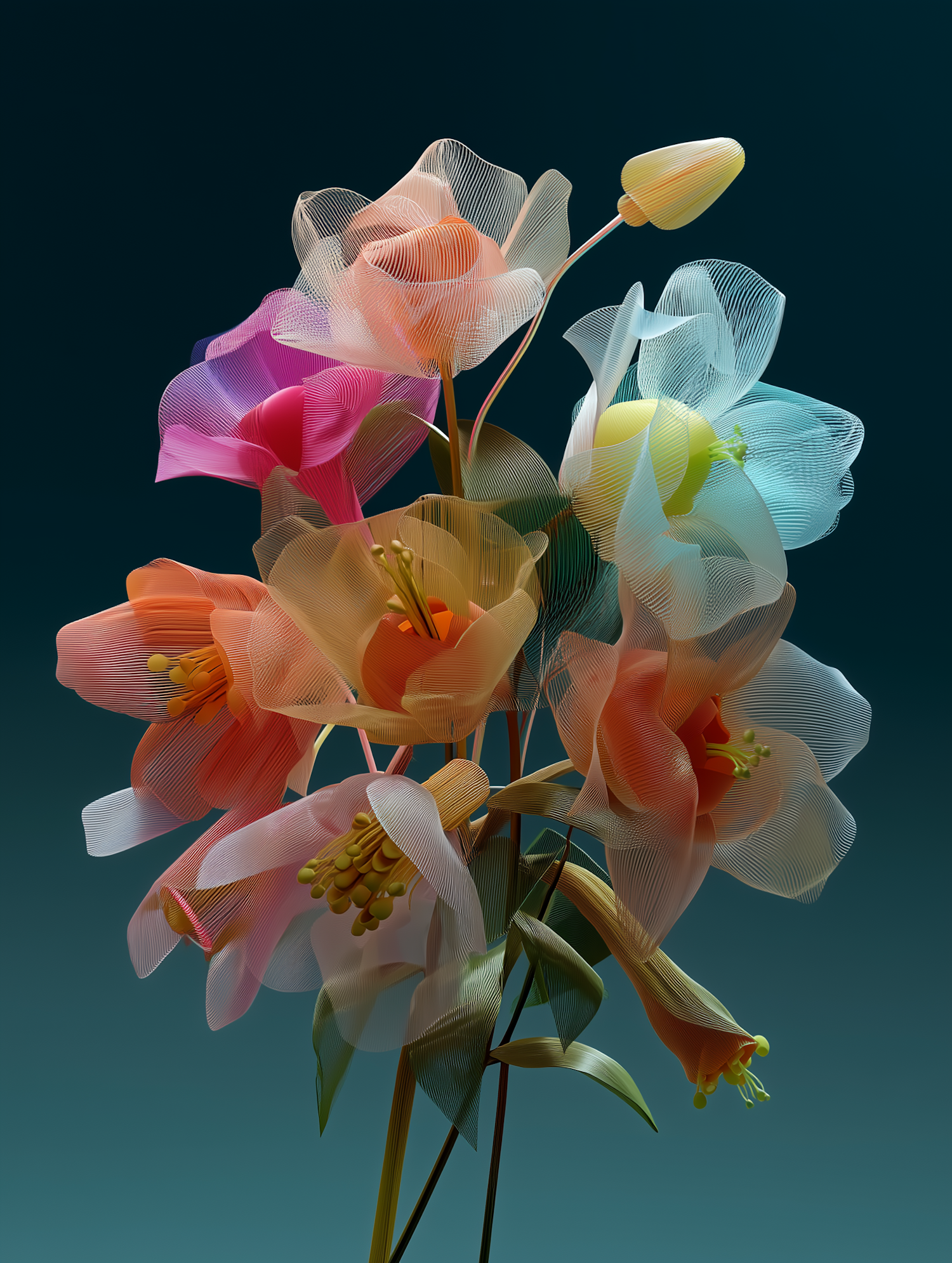 A vibrant digital bouquet of translucent, abstract flowers in orange, pink, and blue hues against a deep teal background.