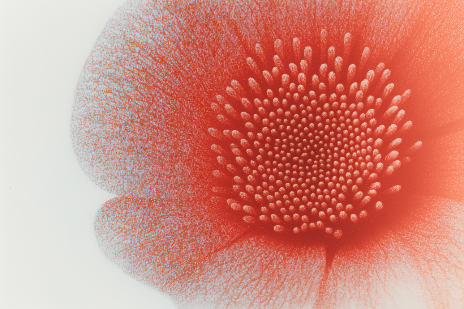 Abstract close-up of a red flower's center with intricate textures and soft gradients, set against a clean white background.