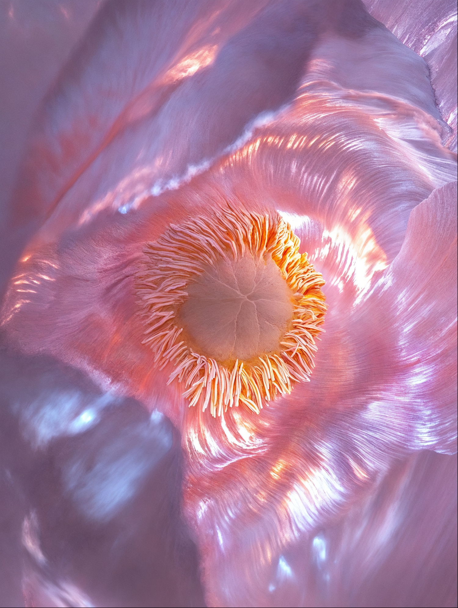 A mesmerizing close-up of a flower's center with glowing pink petals and vibrant orange filaments, creating a dreamy, ethereal vibe.