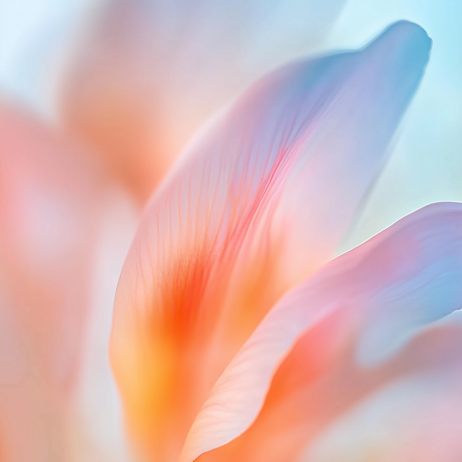 Abstract close-up of flower petals in pastel hues of orange, pink, and blue, showcasing delicate textures and a dreamy gradient effect.