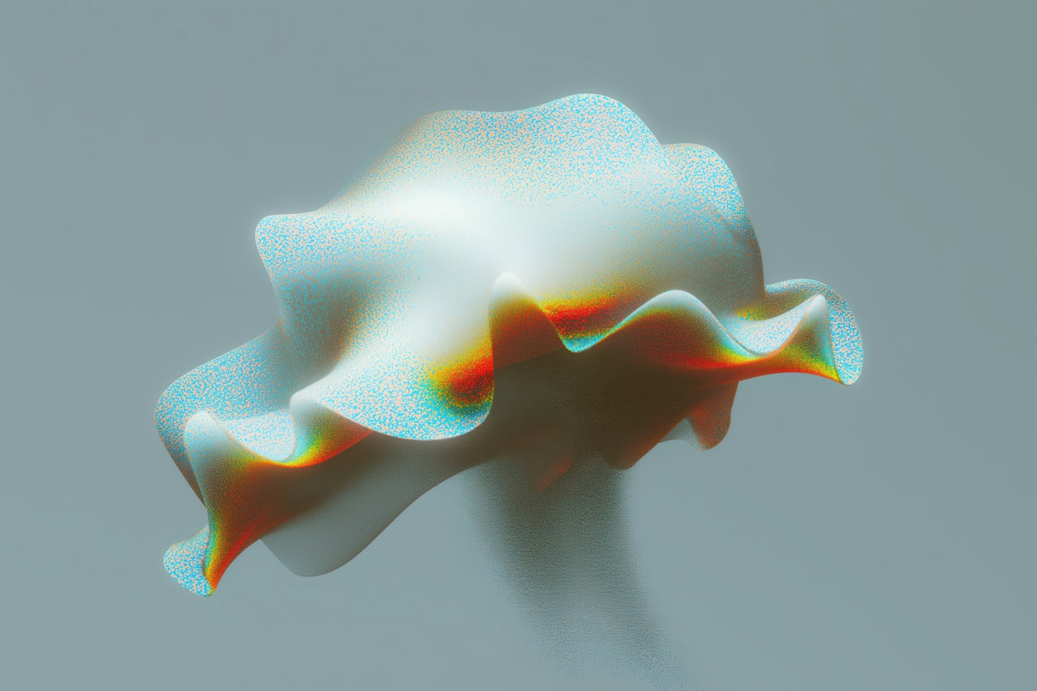 Abstract 3D artwork of a flowing, colorful shape with a pearlescent texture, set against a muted gray background.