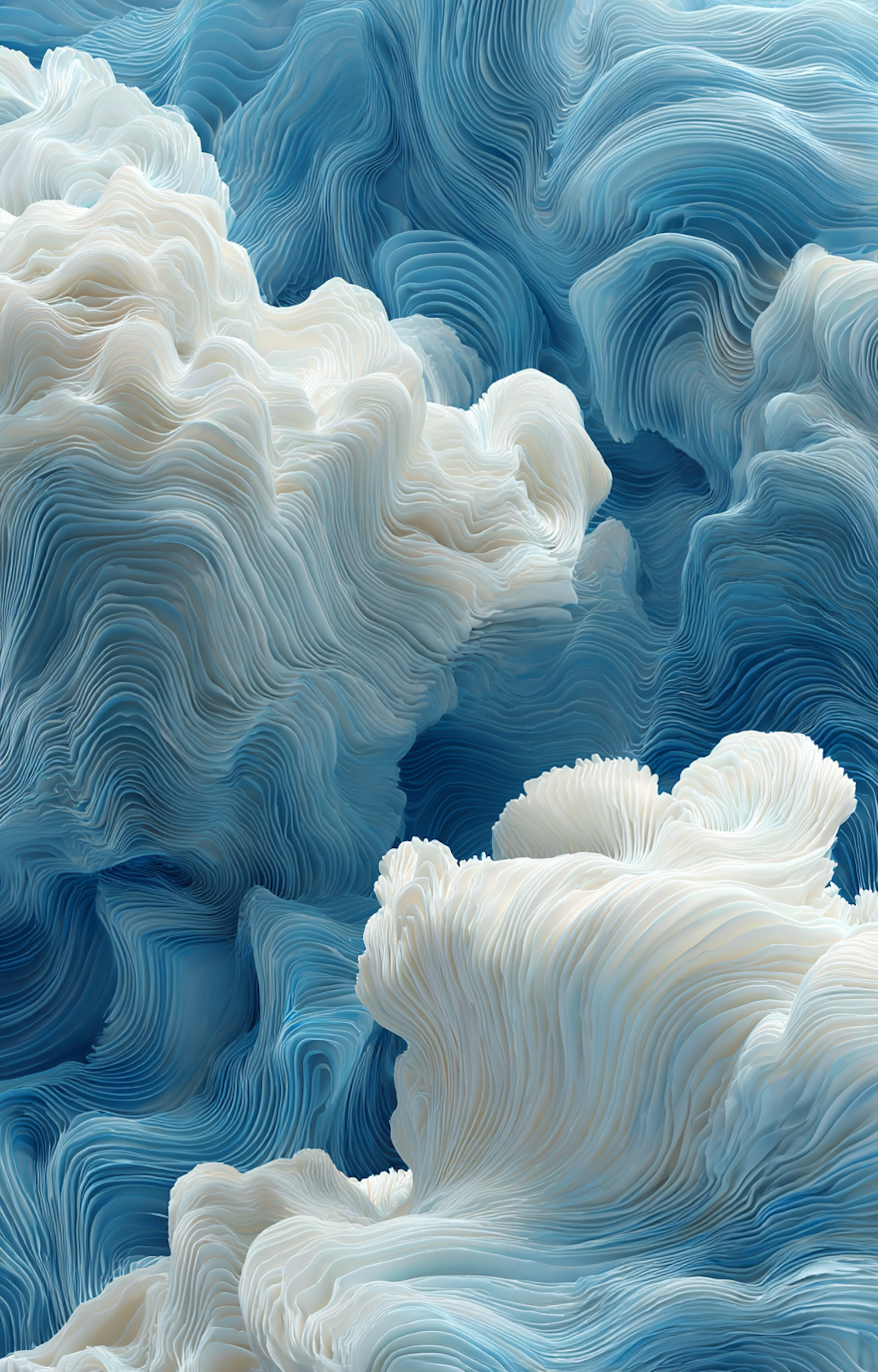 Abstract layered textures in white and blue create a flowing, cloud-like composition with a mesmerizing, three-dimensional effect.