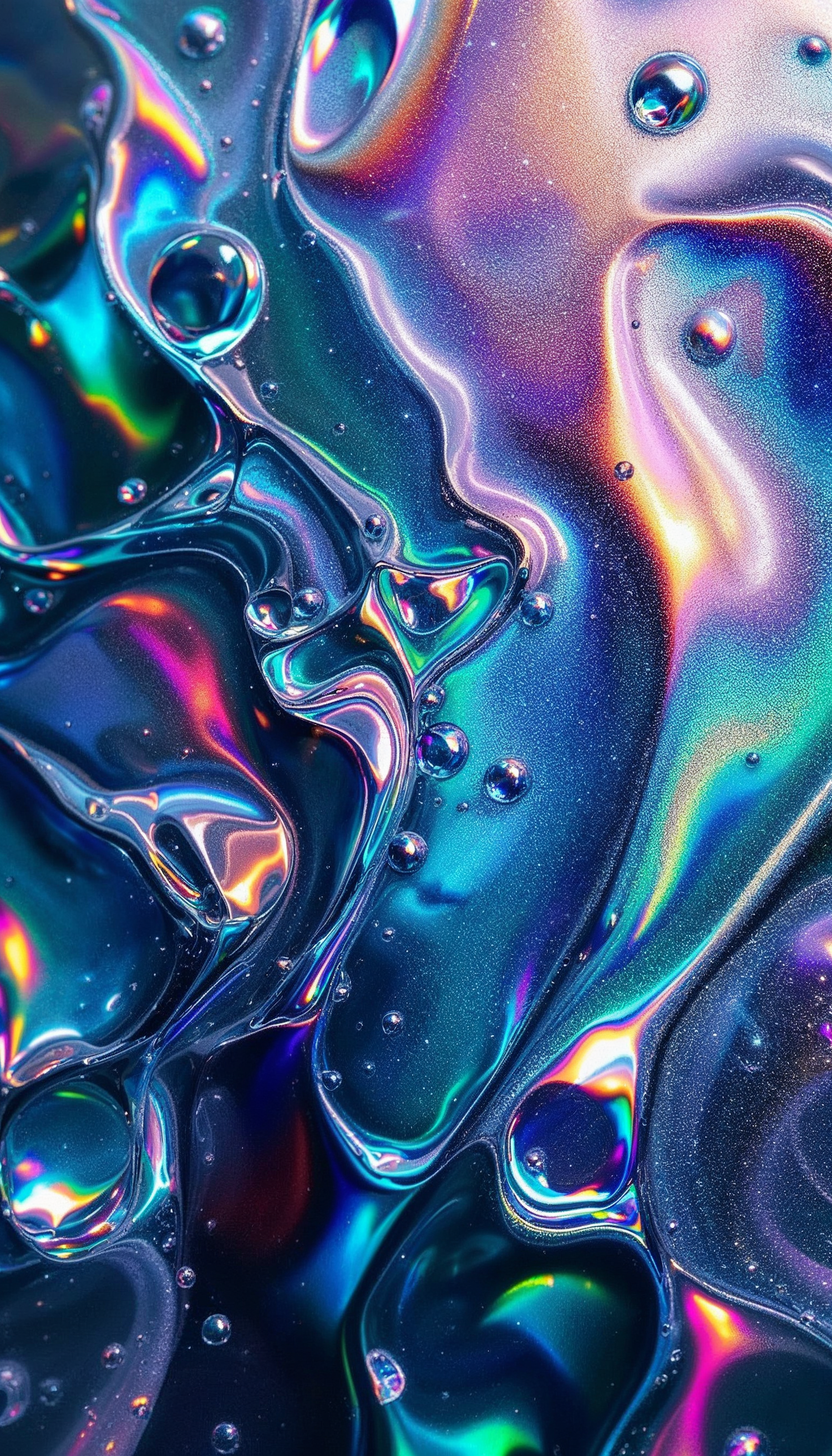 Abstract liquid patterns with iridescent colors and bubbles, creating a vibrant and dynamic visual effect.