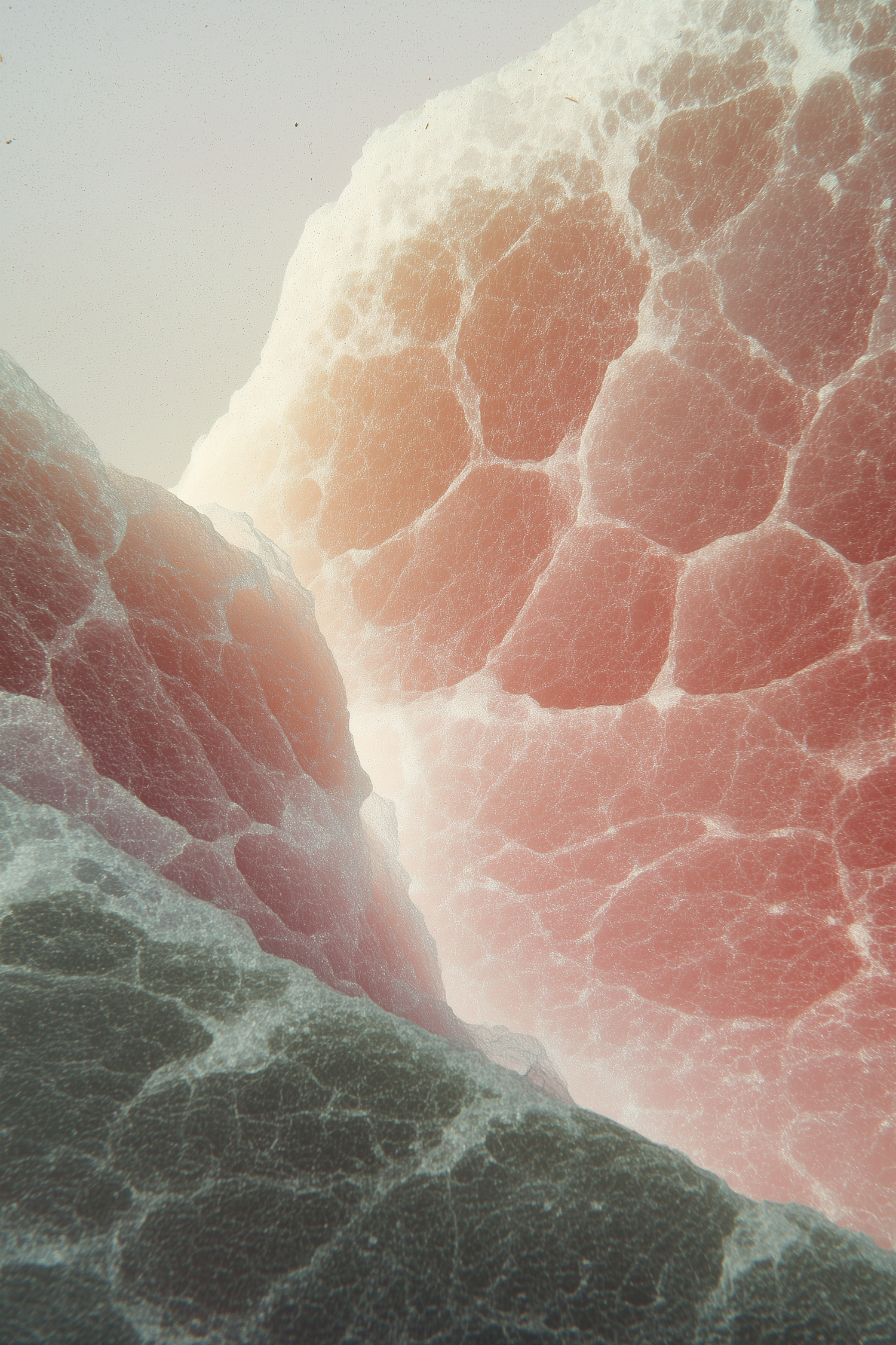 Surreal landscape with pink and white crystalline formations, glowing with light. Ethereal and otherworldly atmosphere.