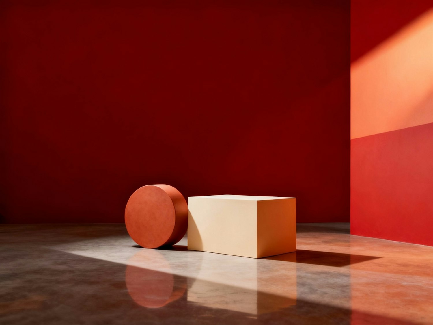 Minimalist scene with red and beige geometric shapes on a polished floor, set against a red wall with dynamic lighting and shadows.