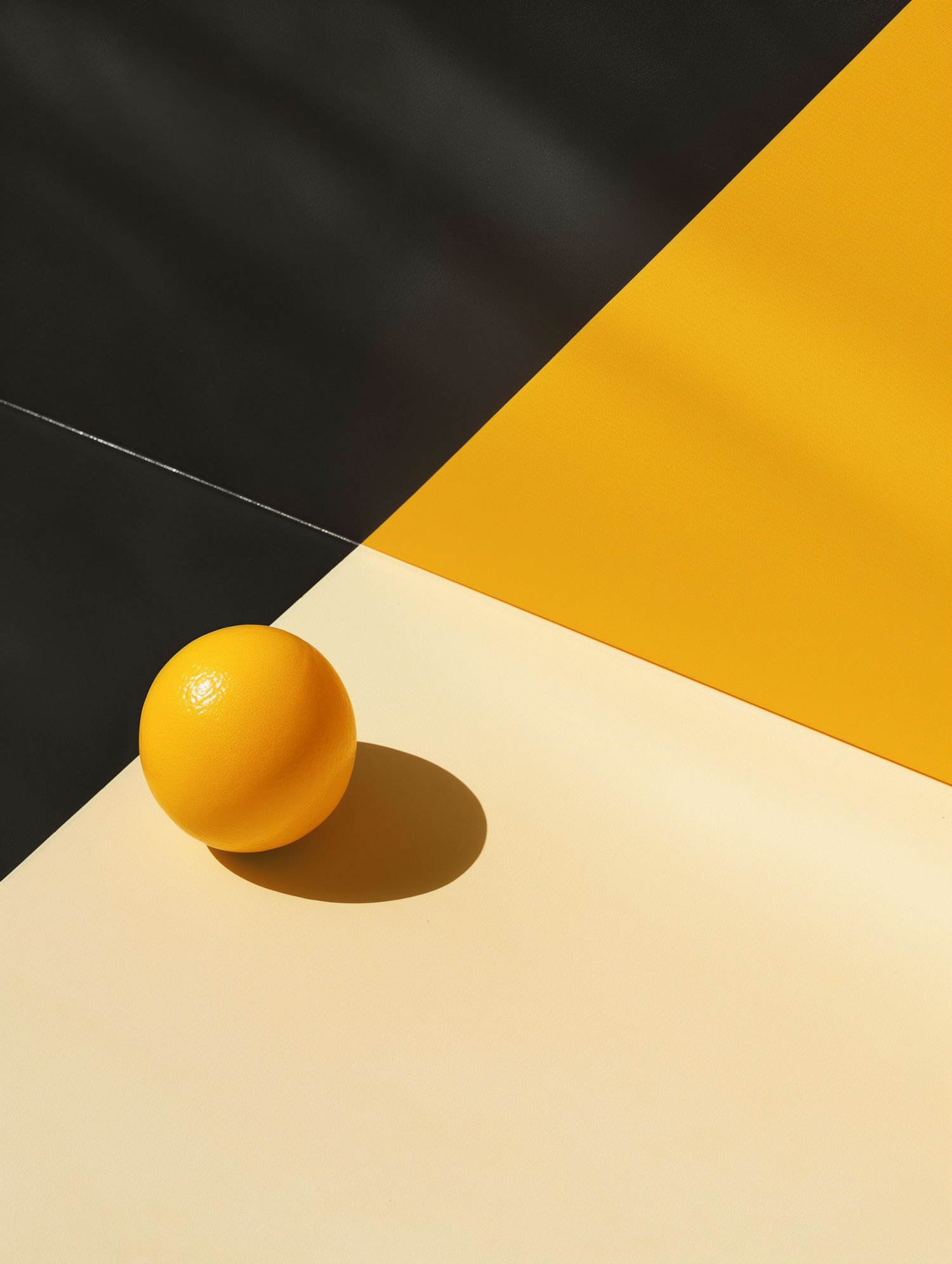A yellow-orange sphere on a geometric background with black, mustard yellow, and cream sections, casting a shadow.