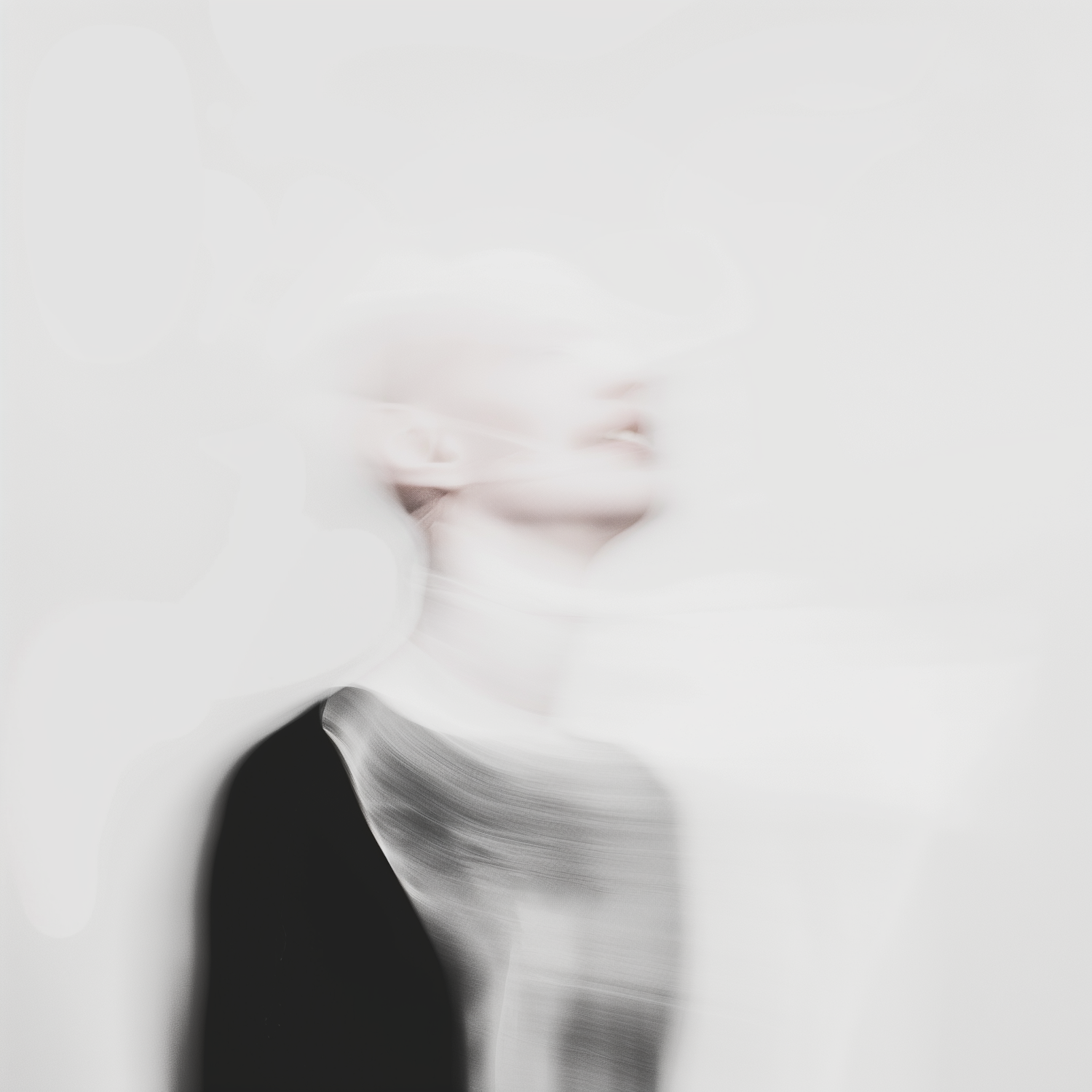 Abstract blurred image of a person with a ghostly appearance, wearing dark clothing against a light, ethereal background.