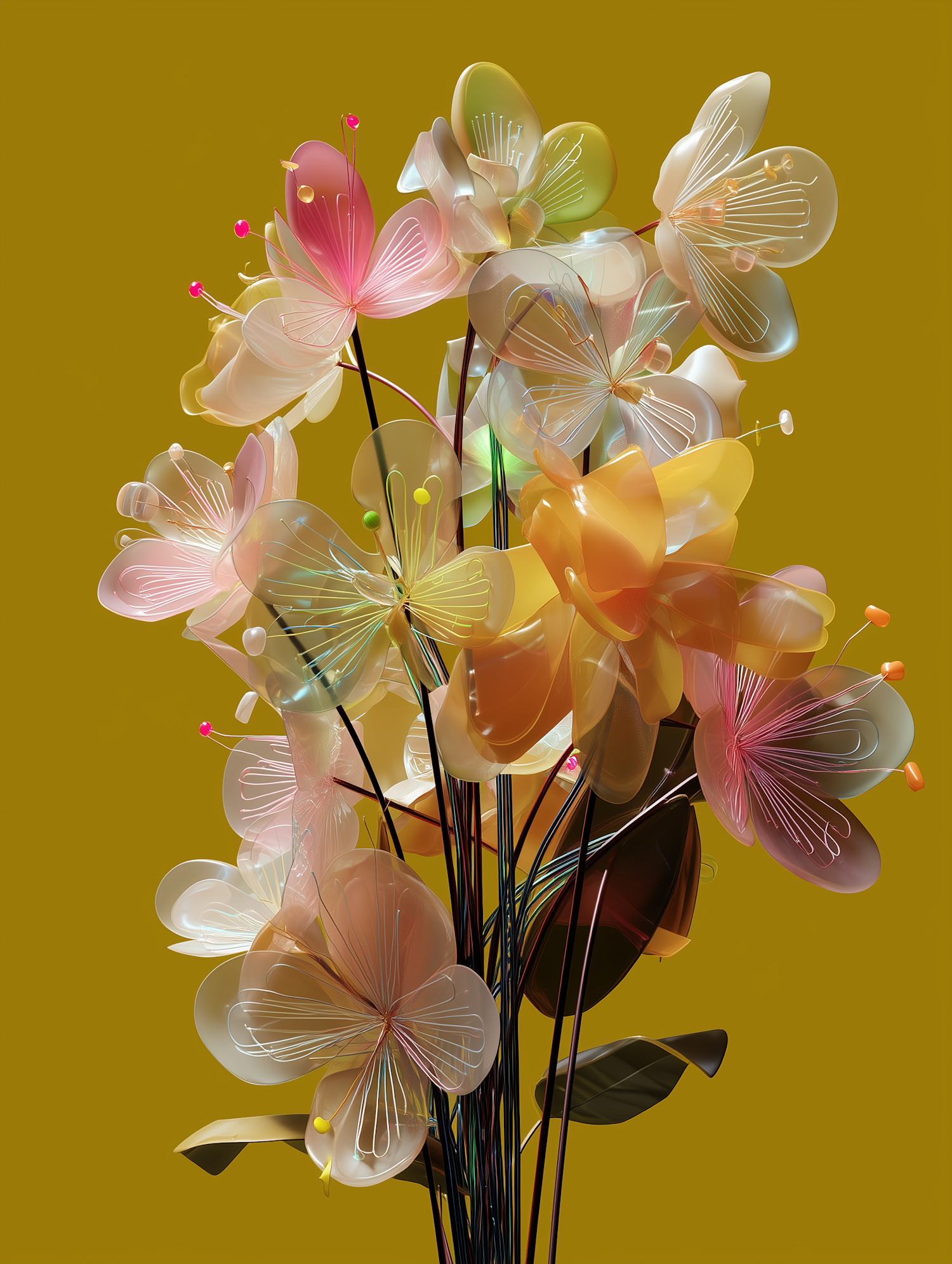 Abstract glass-like flowers in pink, yellow, and green hues on a mustard yellow background, creating a modern and vibrant aesthetic.