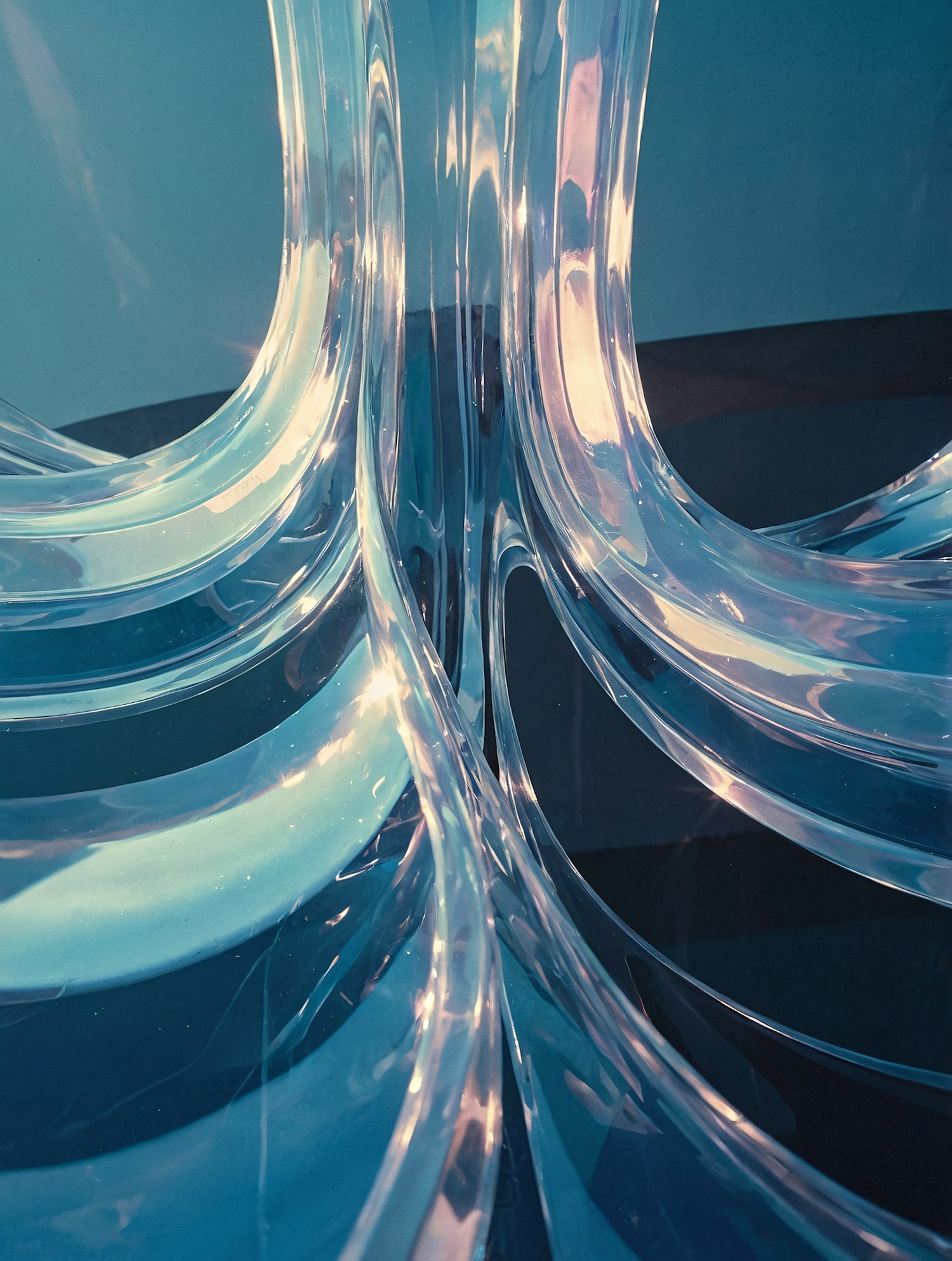 Abstract glass sculpture with flowing curves and light reflections in soft blue, pink, and gold hues against a teal background.