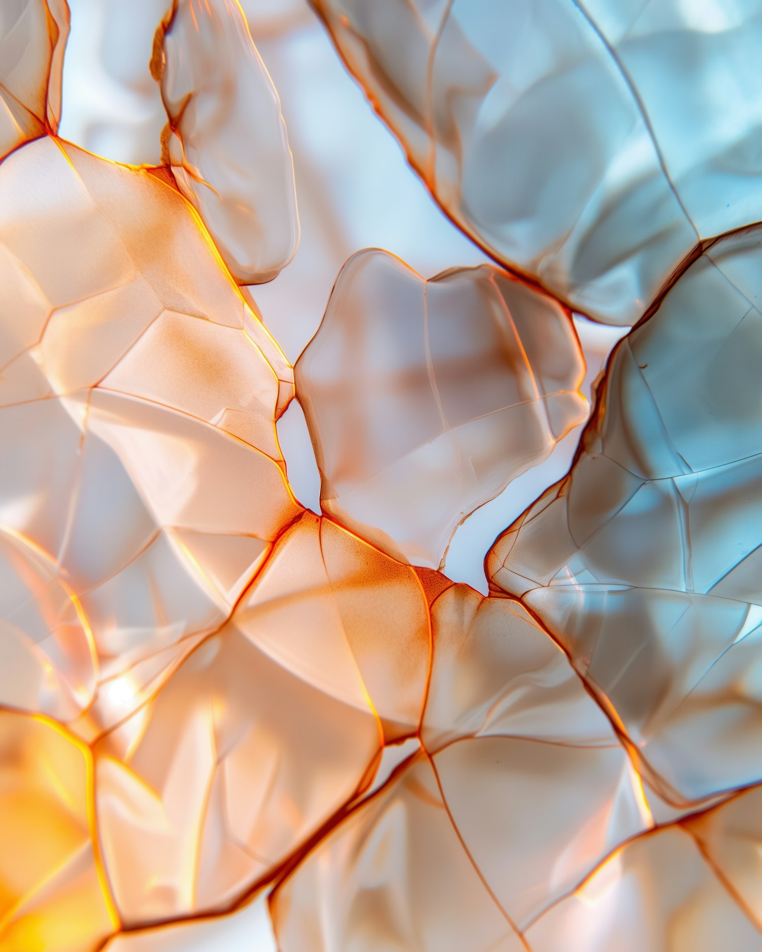Abstract close-up of translucent surfaces with orange and blue tones, resembling cracked glass or ice, glowing with refracted light.