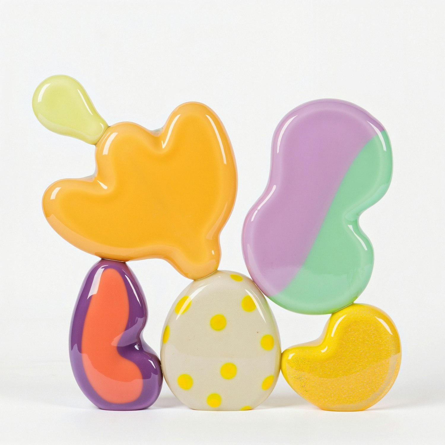 Colorful abstract shapes stacked in a playful arrangement with glossy finish, featuring orange, purple, green, and yellow hues.