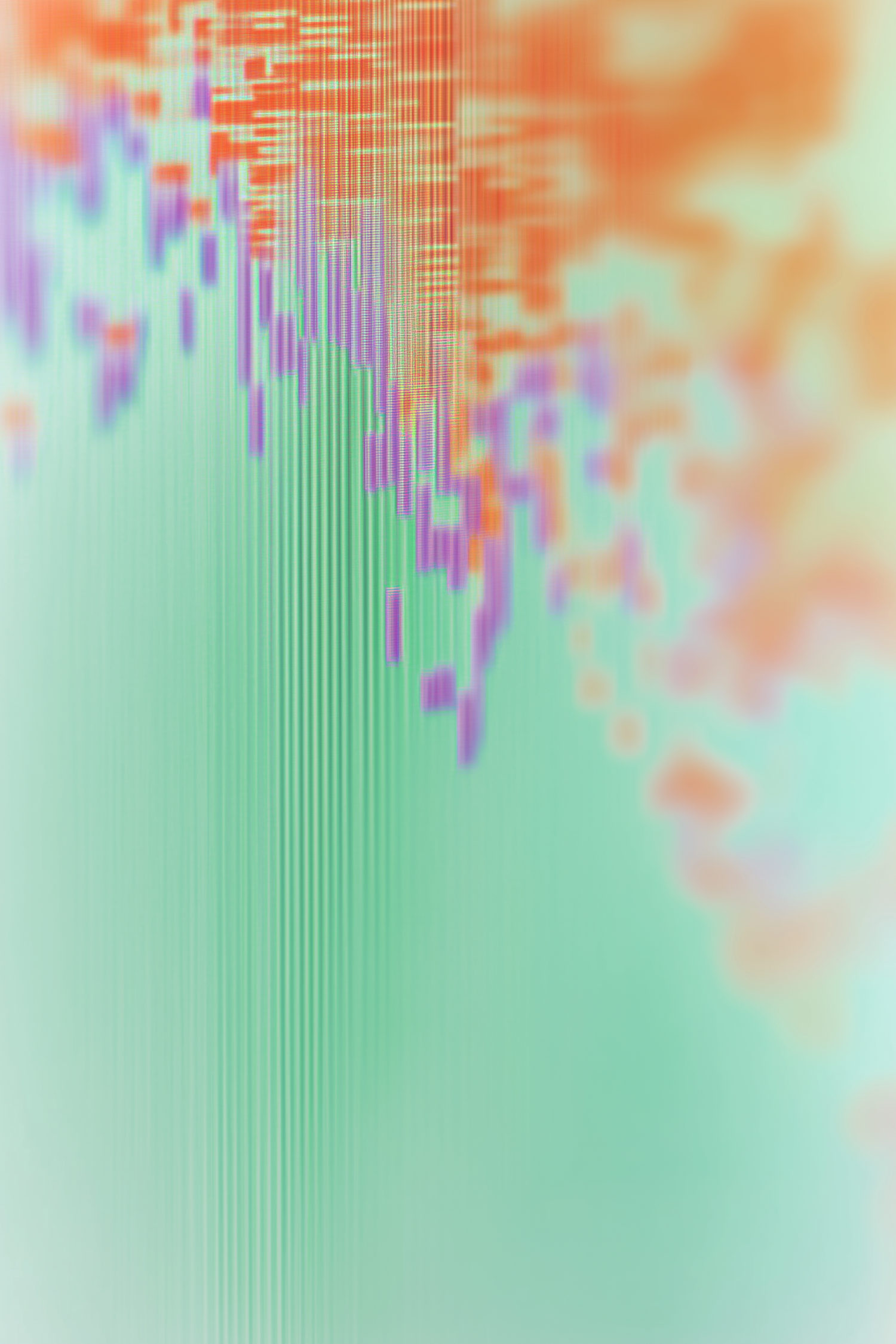 Abstract digital art with green, orange, and purple gradients, vertical lines, and pixelated blocks in a soft, blurred composition.