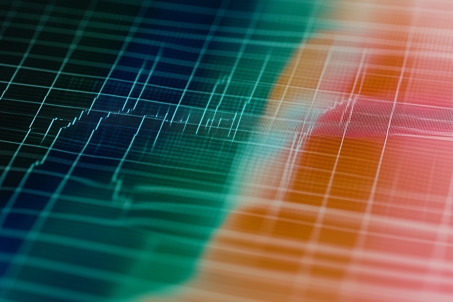 Abstract grid pattern with vibrant green, teal, orange, and red gradient, resembling data visualization or futuristic design.