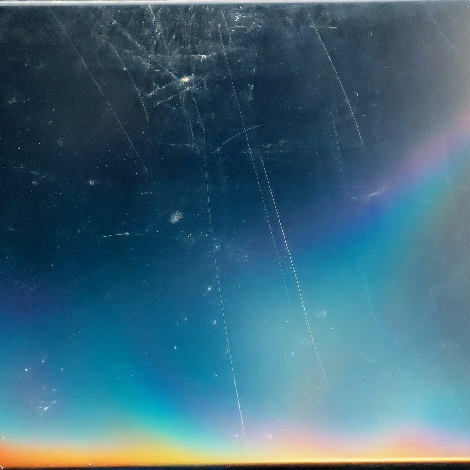 Abstract image with a gradient of blue, orange, and purple hues, featuring scratches and a faint rainbow arc for a textured, dreamy effect.