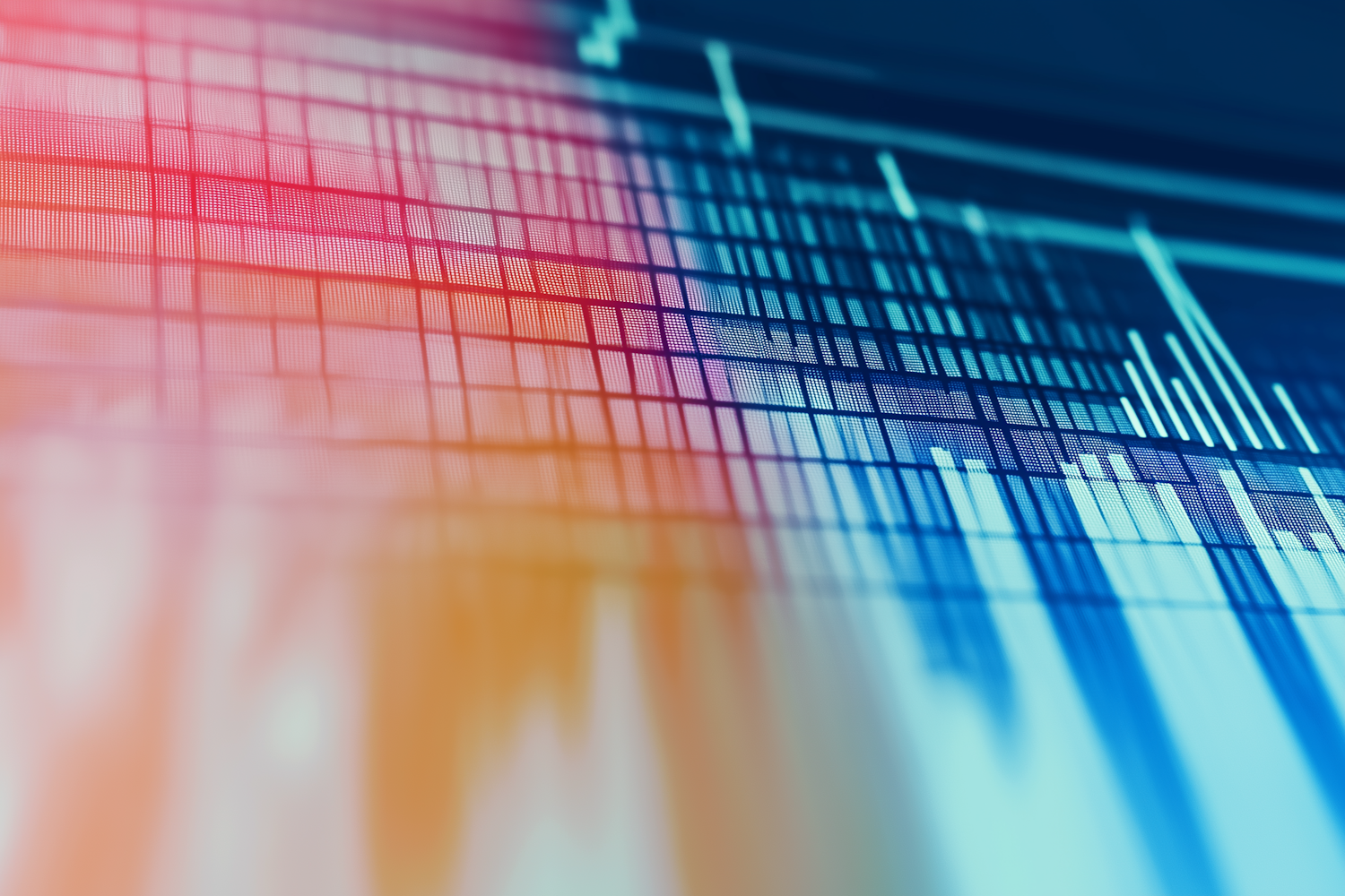 Abstract grid pattern with vibrant red, orange, and blue tones, creating a futuristic and digital aesthetic with intersecting lines.