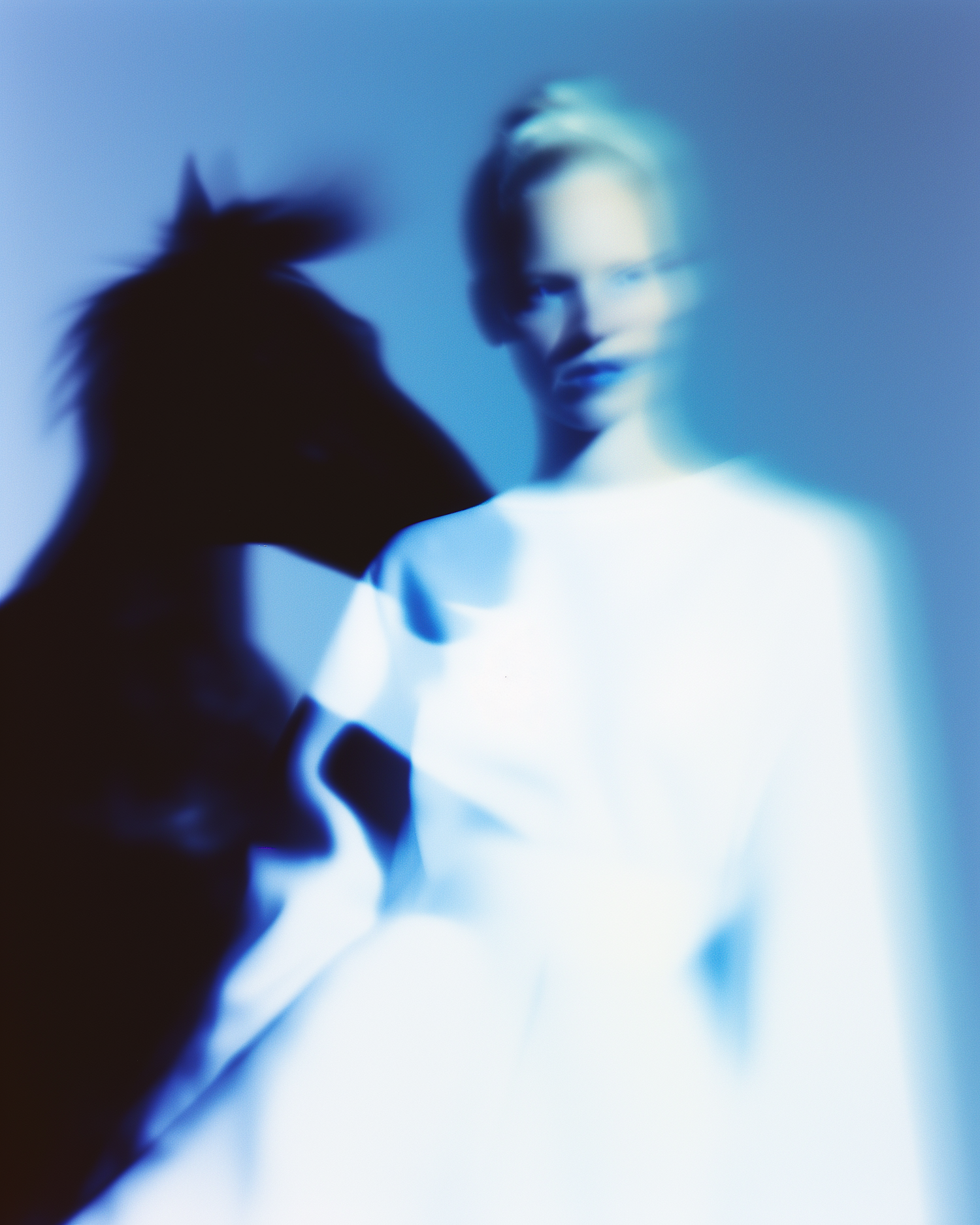 Abstract blurred image of a person in white and a horse silhouette, set against a cool blue background with surreal lighting.